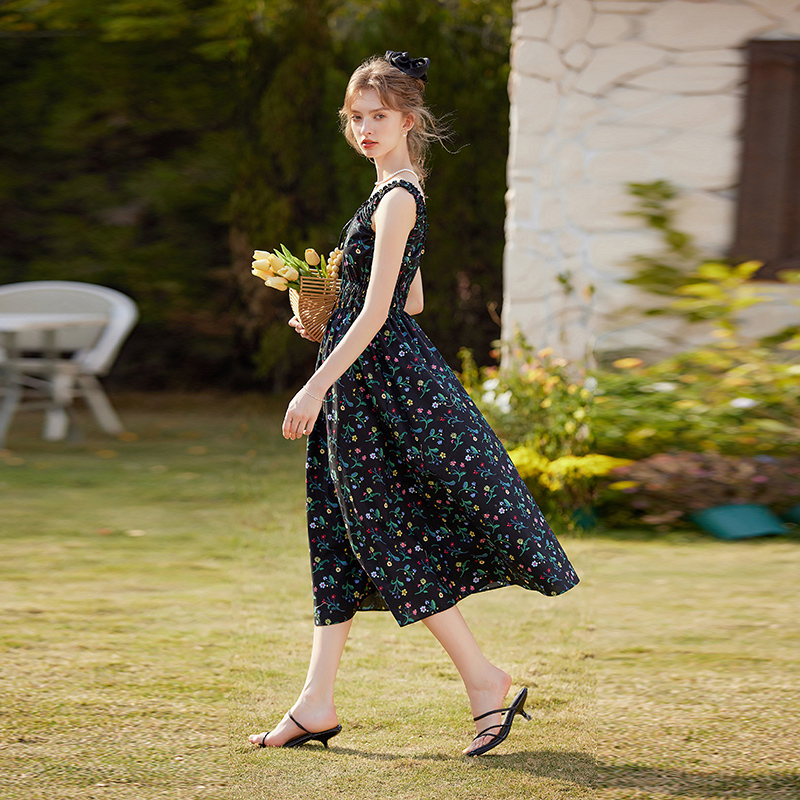 长裙25夏季 女式 时尚 圈无袖 连衣裙 大圆领松紧袖 白鹿语气质印花修身