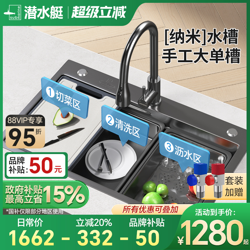 潜水艇纳米手工大单槽厨房洗菜盆304不锈钢水槽家用洗碗池台下盆