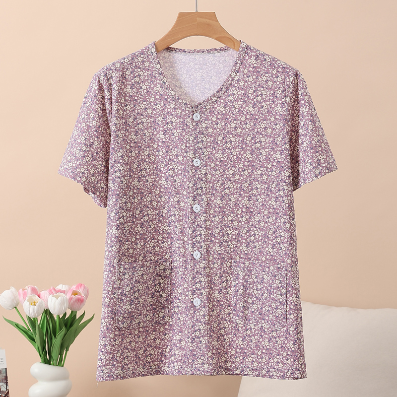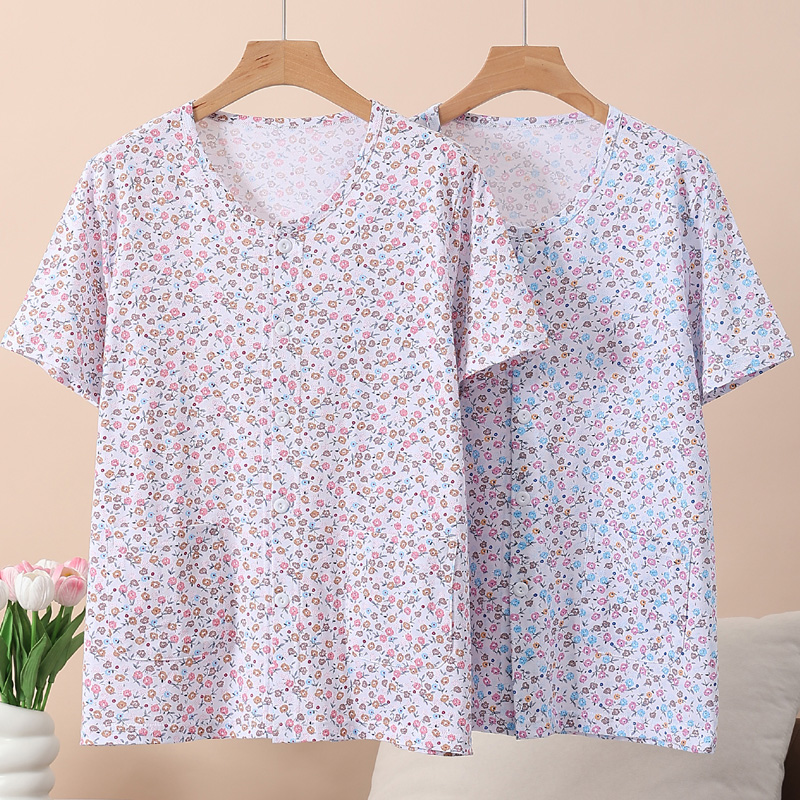 家居汗衫 女士纯棉短袖 上衣碎花妈妈半袖 系扣婆婆衫 背心中老年开衫