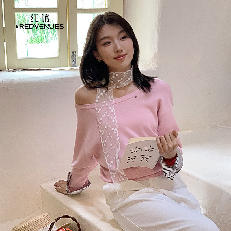 斜领温柔独特小衫 红馆2025新款 一字肩上衣独特漂亮早秋粉色针织衫