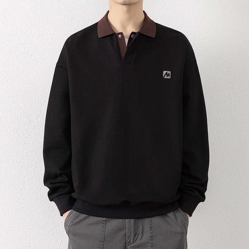 高街痞帅肌理感卫衣宽松休闲打底衫 V37老钱风亨利领长袖 T恤男秋季