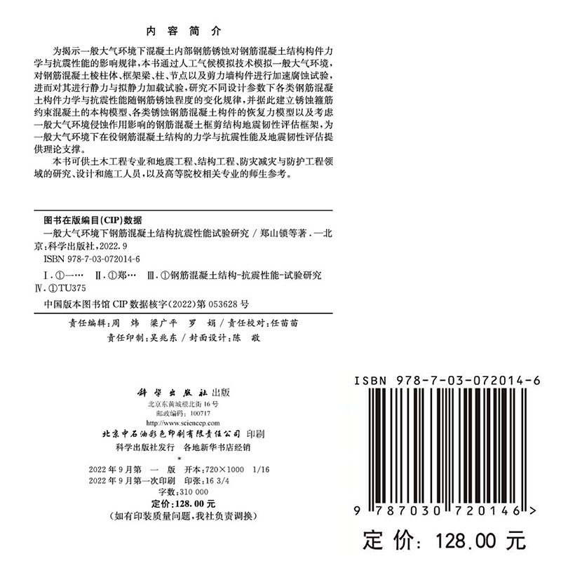 现货 社 一般大气环境下钢筋混凝土结构抗震性能试验研究 科学出版 9787030720146 郑山锁等 正版