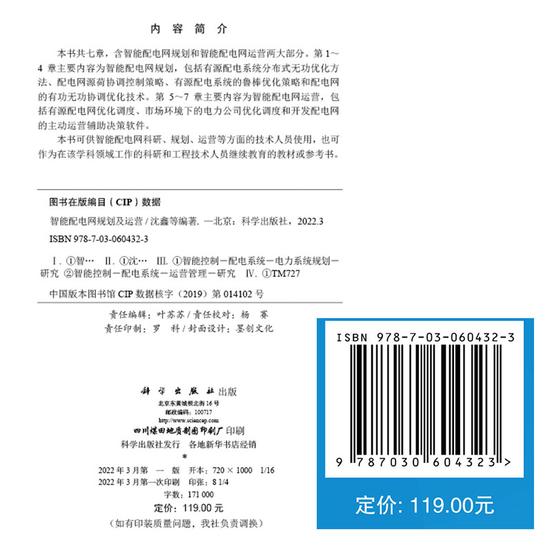 现货智能配电网规划及运营沈鑫等编著科学出版 社9787030604323