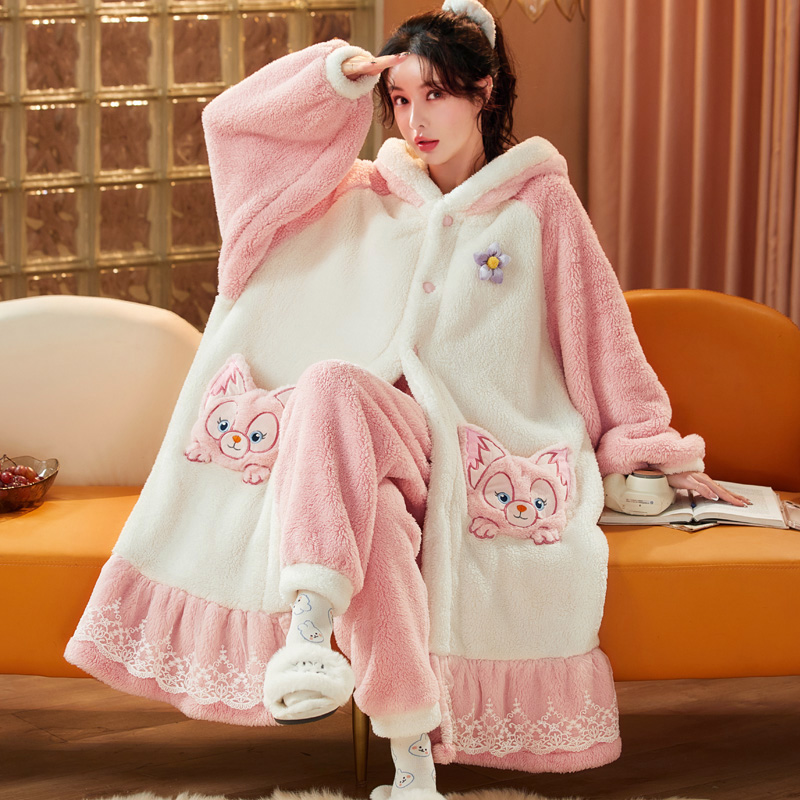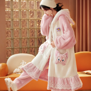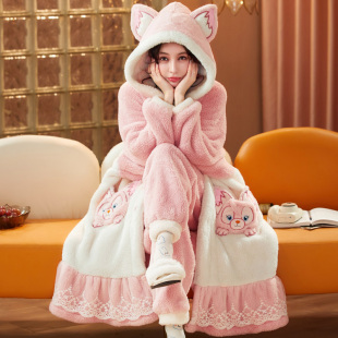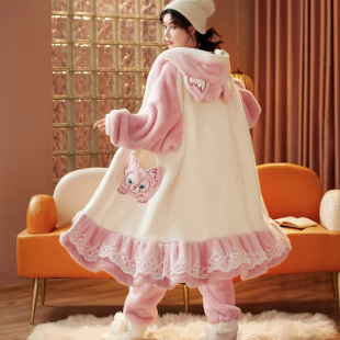 法兰绒睡袍秋冬家居服套装 珊瑚绒睡衣女冬季 加厚可爱卡通少女长款