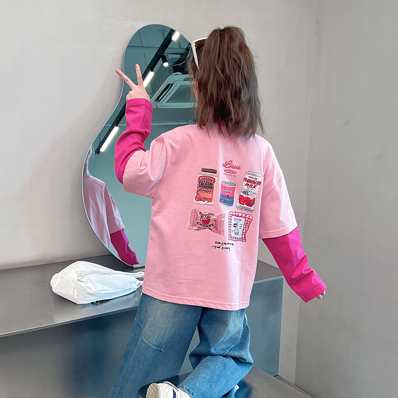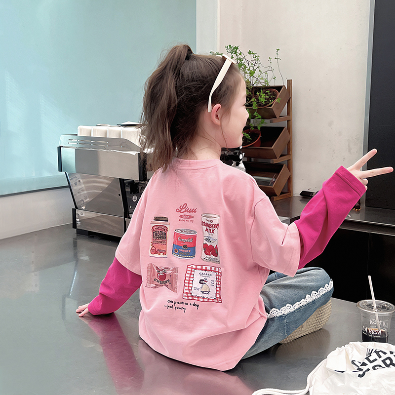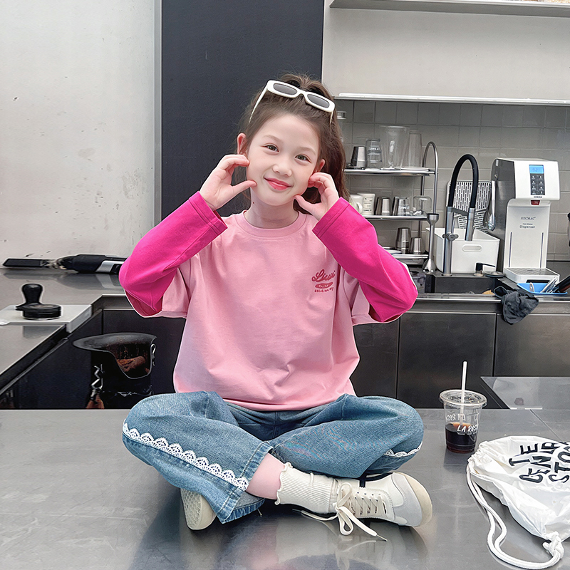 新款 儿童宽松假两件洋气t恤女童长袖 上衣大童内搭打底2025春秋装
