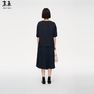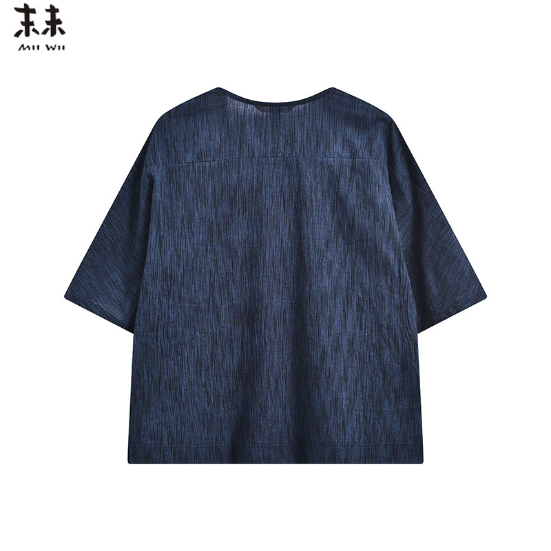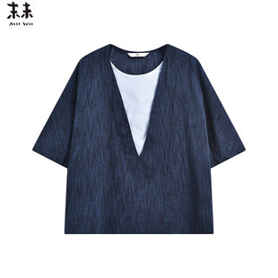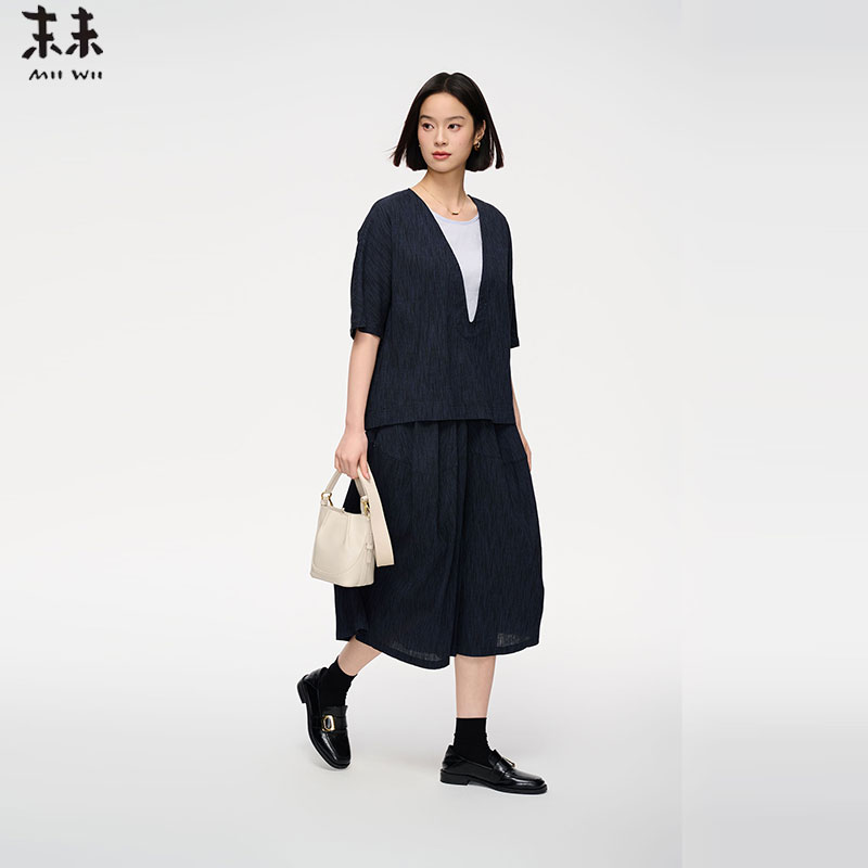 MIIWII末未25夏藏青色V领休闲百搭短袖 麻感宽松上衣女S252338