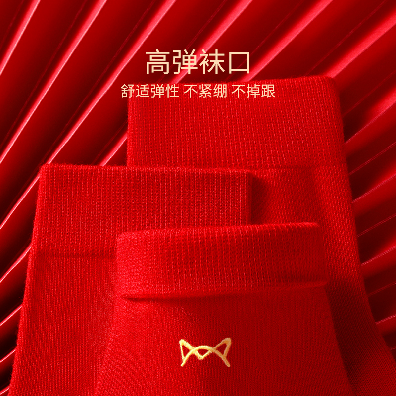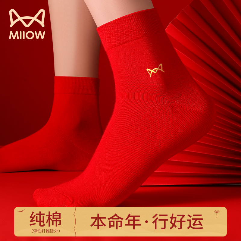 猫人本命年红色袜子男士 纯棉鸿运中筒袜女结婚礼物蛇年春秋棉袜子