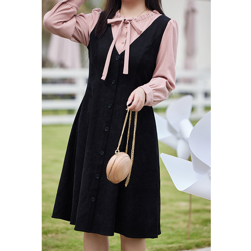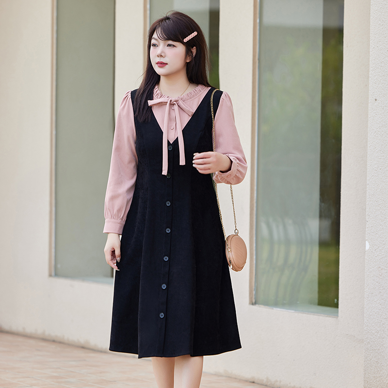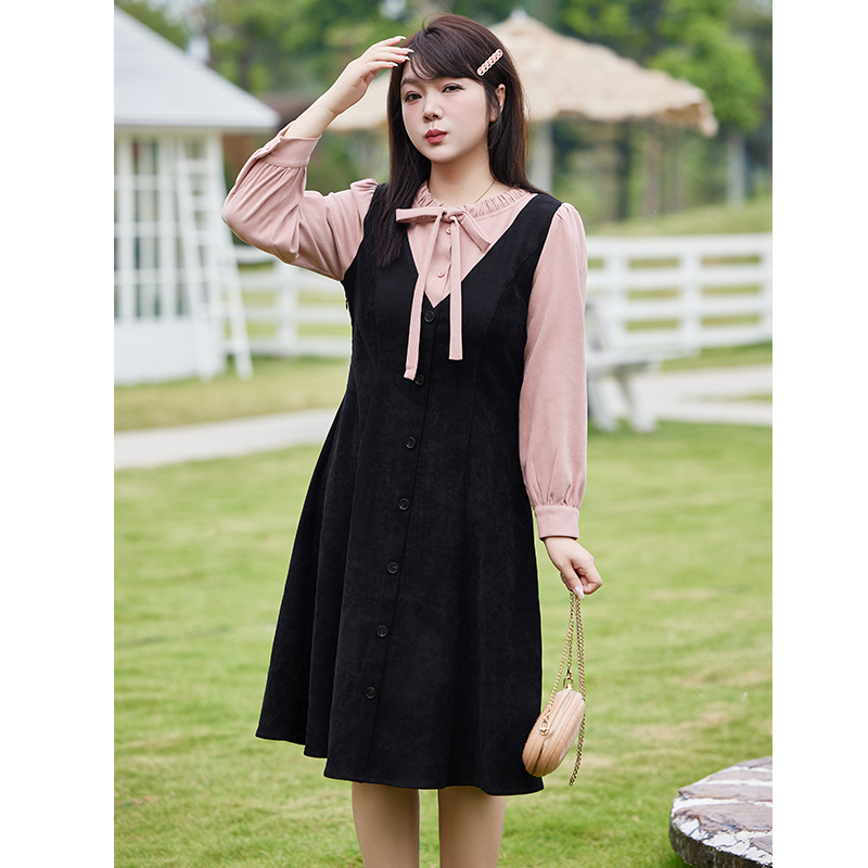 长裙遮肚子显瘦胖MM大码 木耳边领收腰A字法式 磨毛连衣裙 新款 冬装