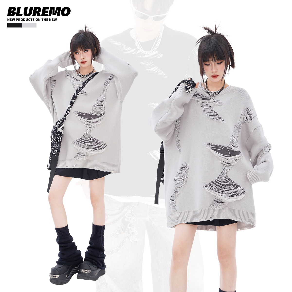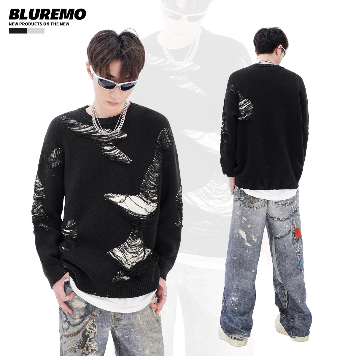 BLUREMO 不规则撞色破洞潮流百搭针织毛衣潮 模糊情绪秋冬高街个性