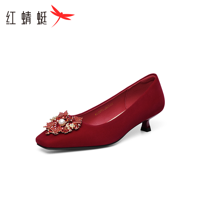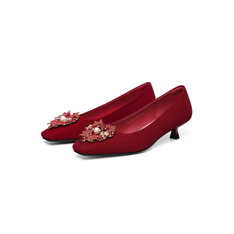 女2025新款 喜婆婆婚宴鞋 浅口高跟鞋 酒红色妈妈鞋 女鞋 华耐粗跟单鞋