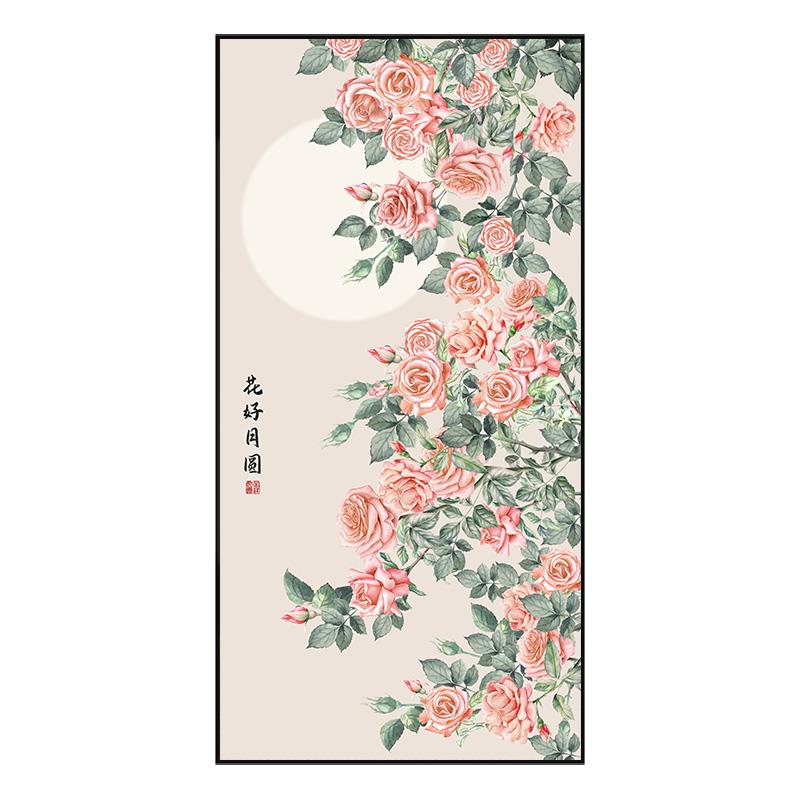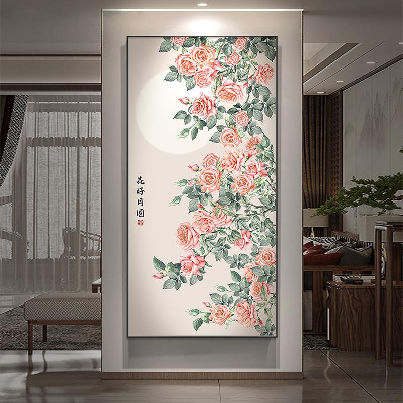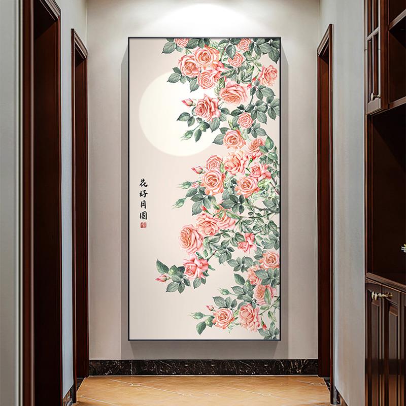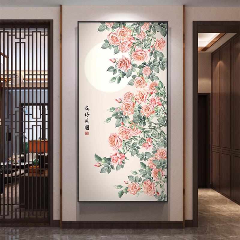 画过道壁画 饰画花好月圆走廊尽头挂画大气竖版 蔷薇花新中式 玄关装