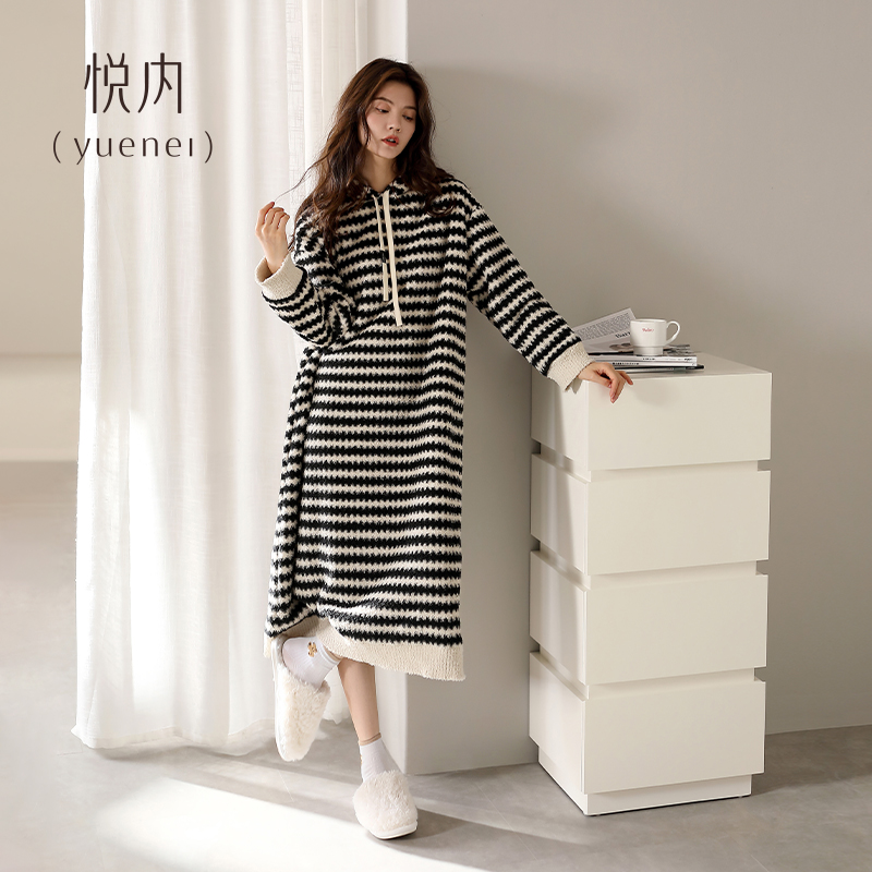 贝妍珊瑚绒睡衣女款 条纹家居服睡裙 秋冬保暖半边绒小香风睡袍大码
