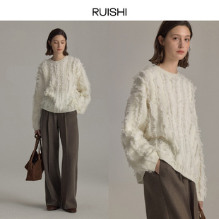 RUISHI芮时 女秋冬 浪漫剪花流苏工艺宽松圆领显瘦软糯羊毛针织衫