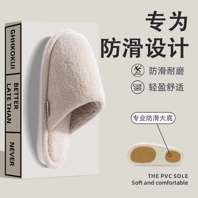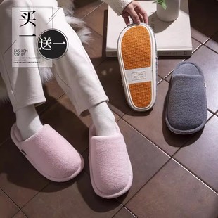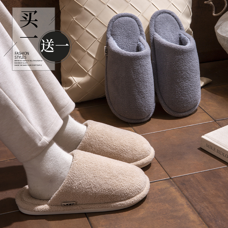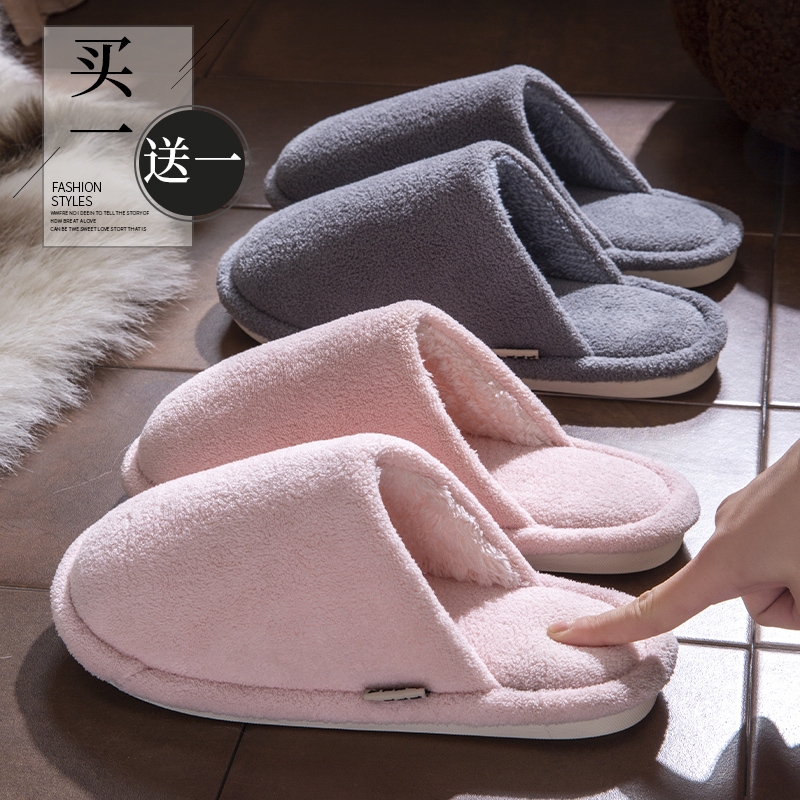 男 情侣家居室内地板防滑软底加绒毛拖鞋 买一送一棉拖鞋 女士秋冬季