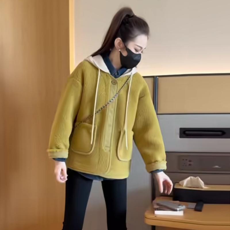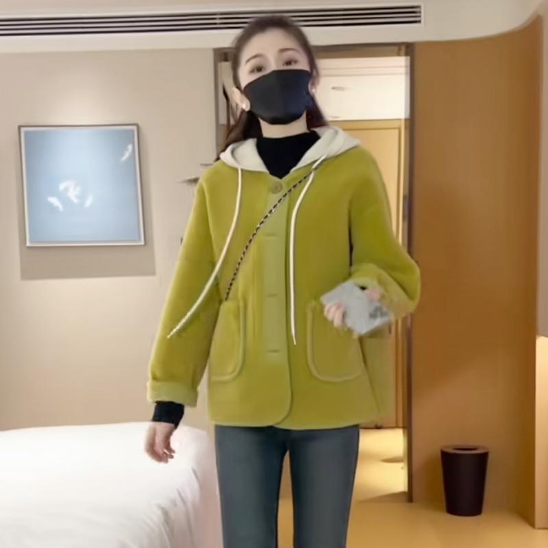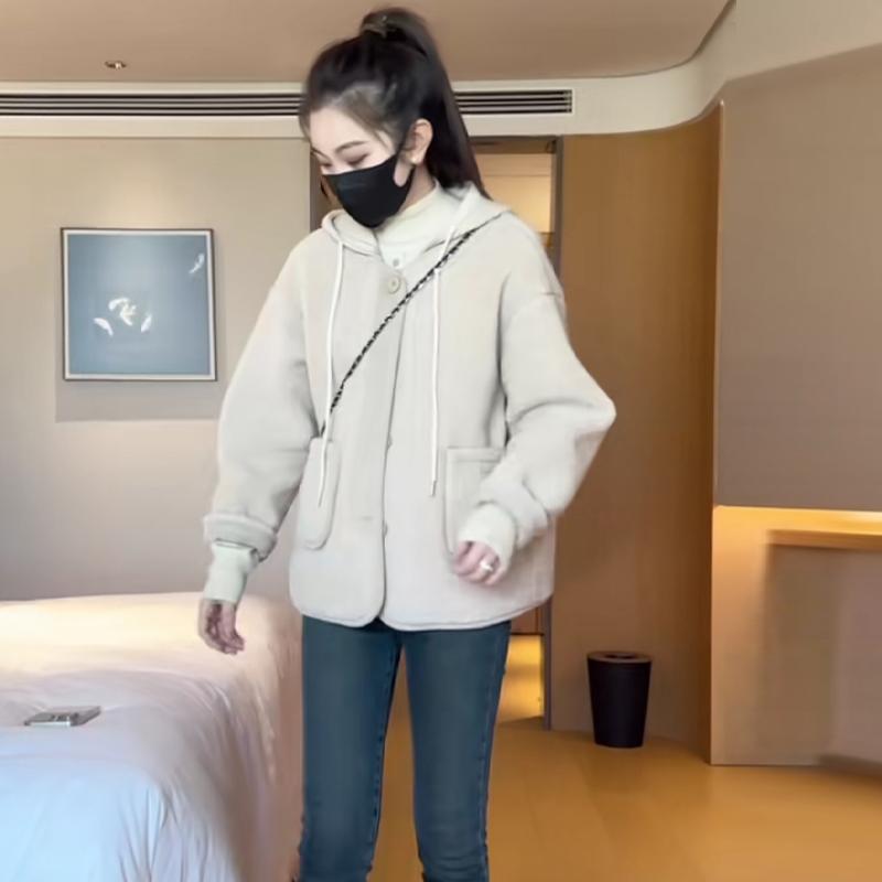 韩版 宽松加厚皮毛一体休闲洋气上衣潮 连帽毛呢外套女2025秋冬季