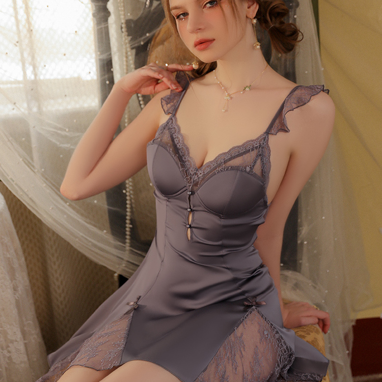 女春秋新款 性感睡衣高级感蕾丝拼接深V带胸垫纯欲风吊带睡裙套装