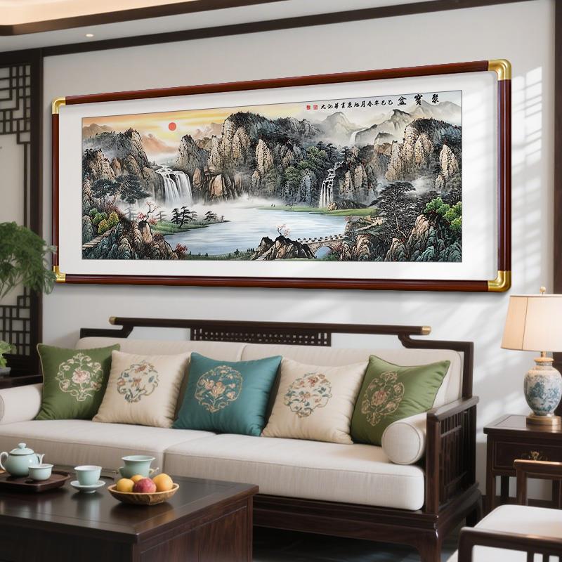 源远流长聚宝盆山水画客厅挂画新中式 饰画西墙聚财壁画 沙发背景装