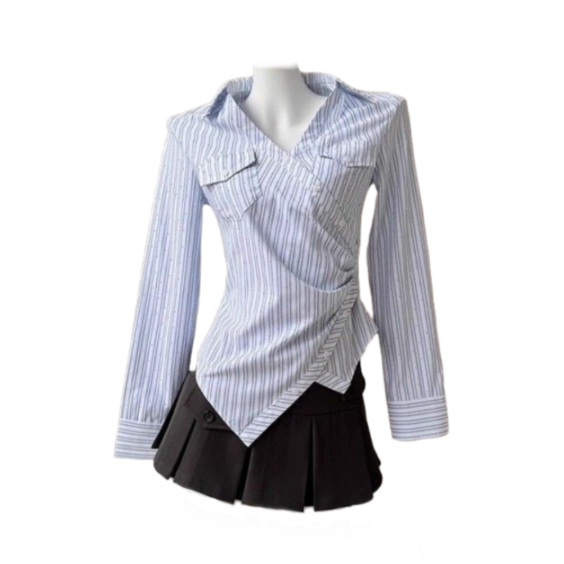 显瘦百褶短裙甜辣风两件套 辣妹大码 韩系设计感不规则修身 条纹衬衫