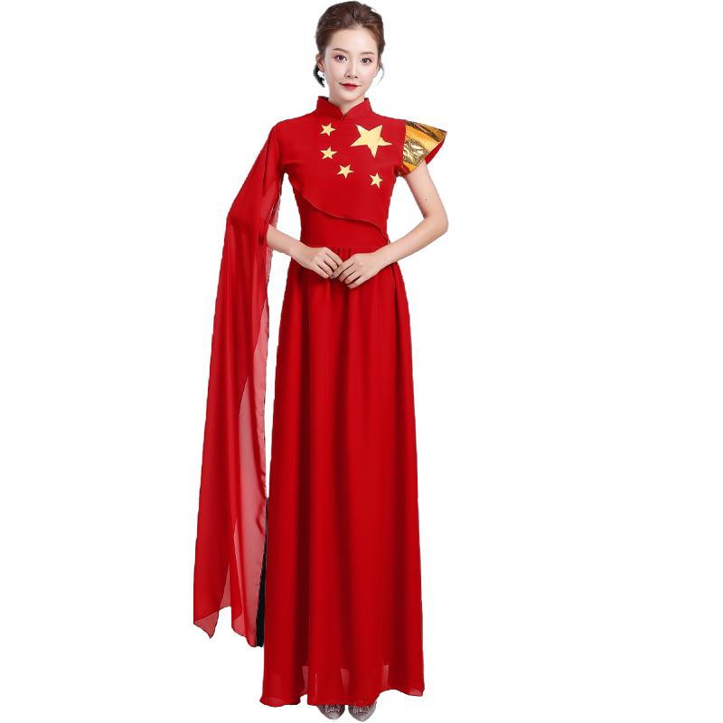 新款 合唱团演奏表演服红歌大合唱演出服女长裙 成人中国风舞台服装