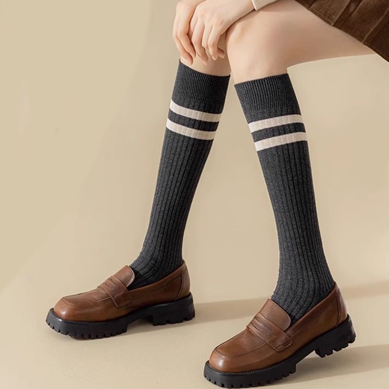 条纹小腿袜女棉袜显瘦秋冬季 灰色长筒袜子加绒压力中筒长袜春秋款