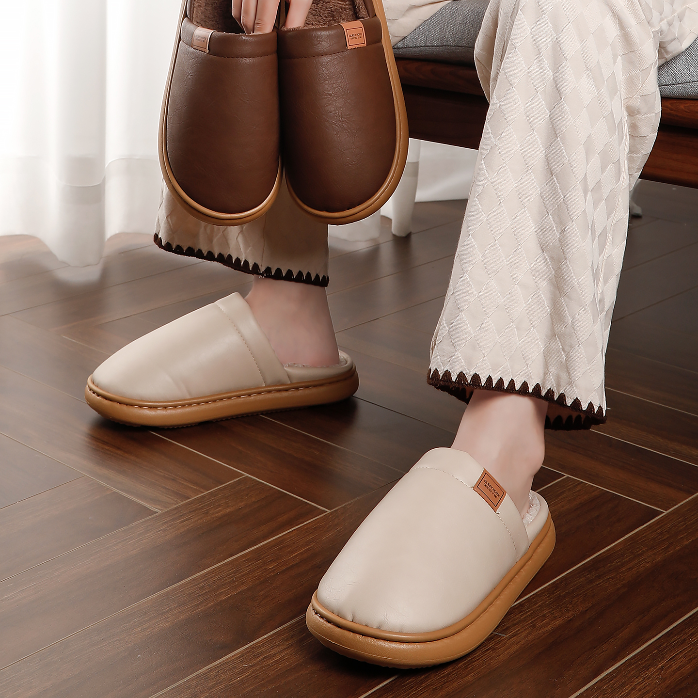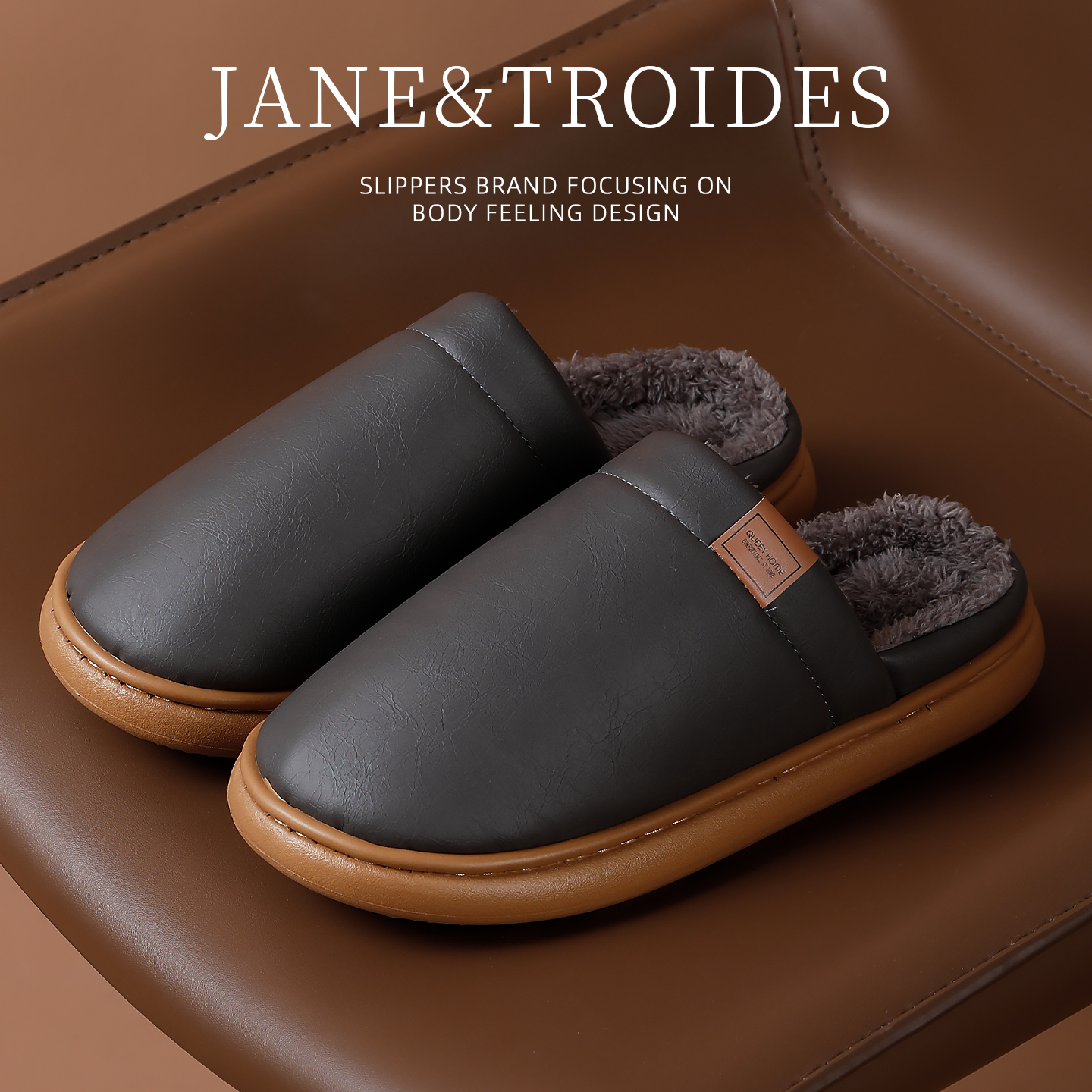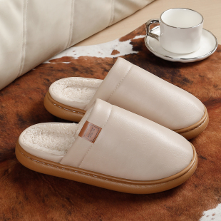 防水棉拖鞋 室内加绒保暖家居家防滑防臭抑菌PU皮拖秋冬天 男女冬季