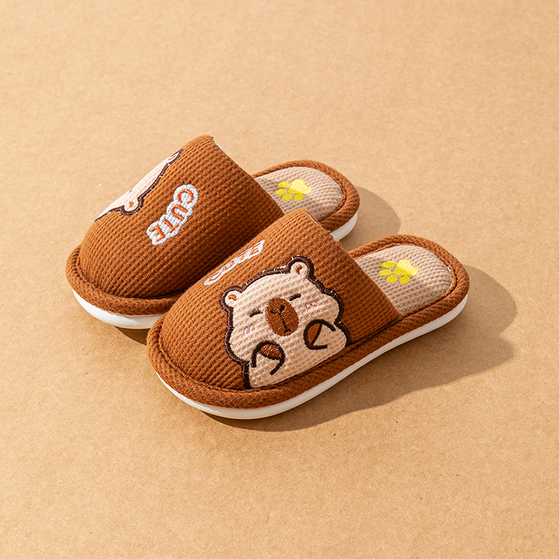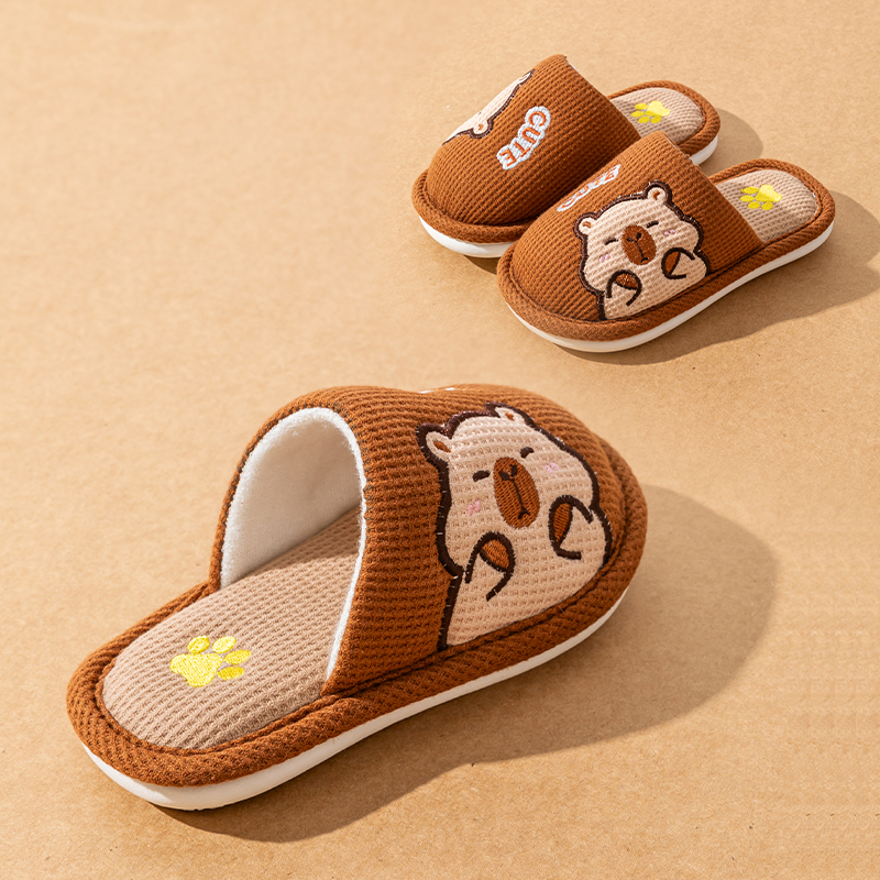 女孩男 男童居家用室内防滑卡通亲子宝宝亚麻布拖鞋 儿童拖鞋 秋冬季