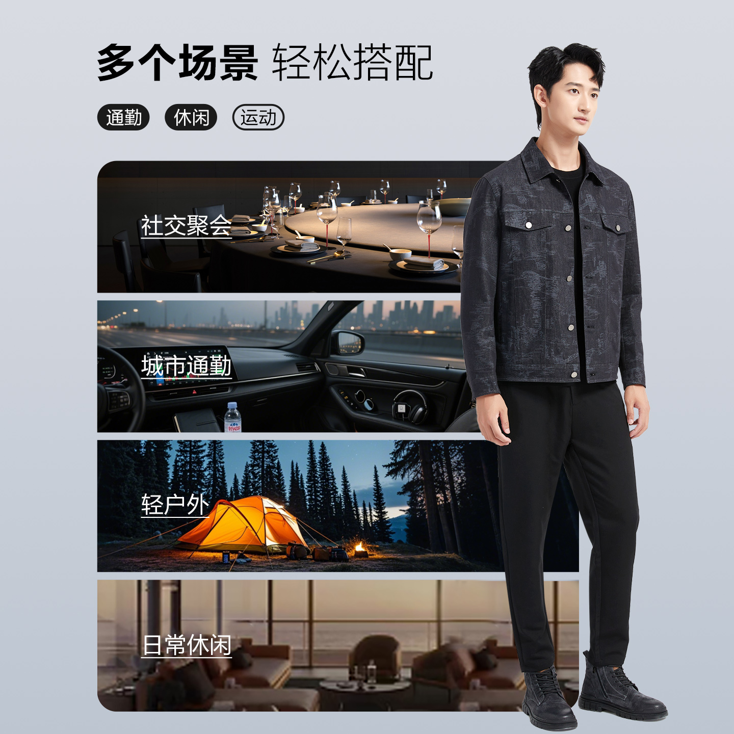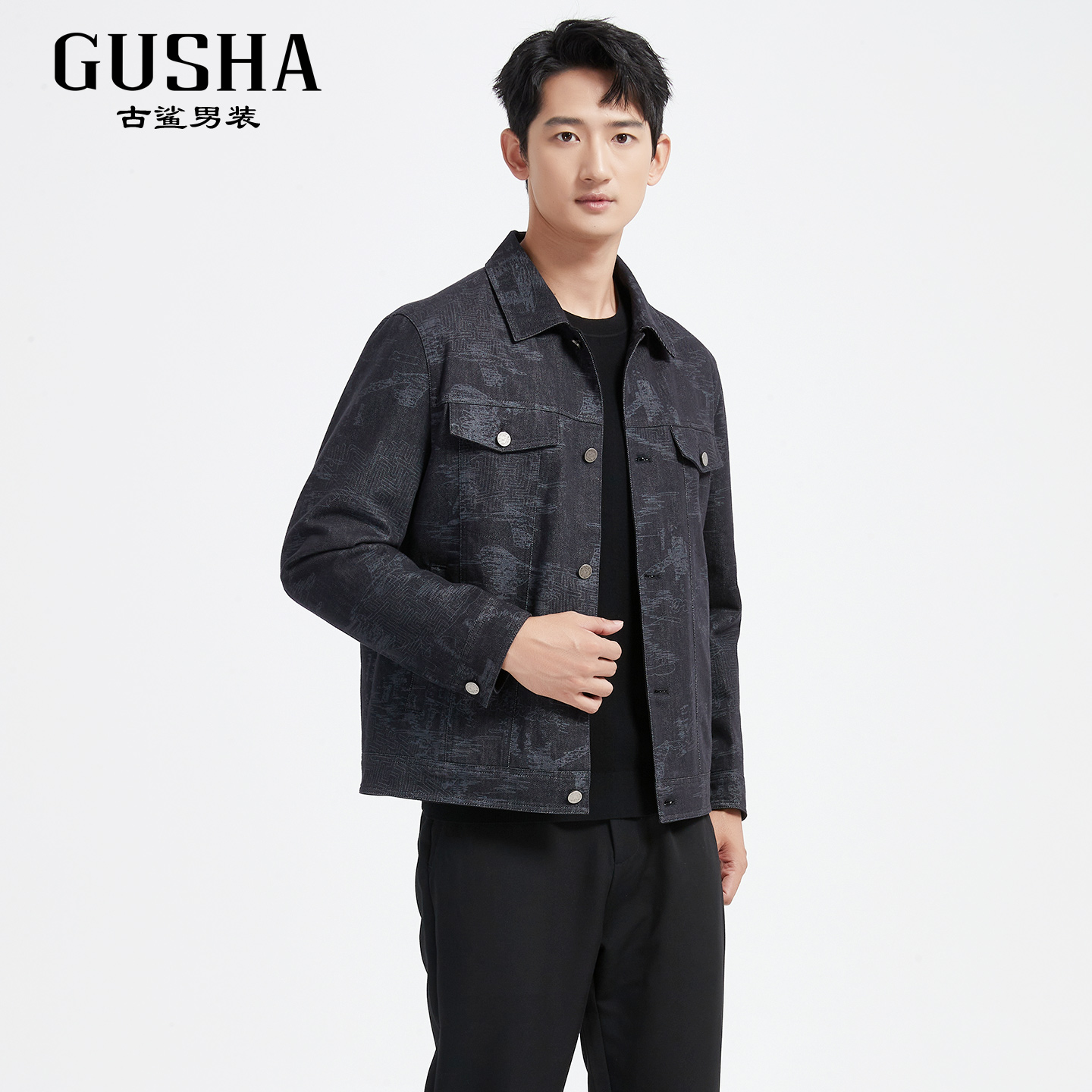 修身 藏青时尚 古鲨满印牛仔夹克男 翻领外套2025秋装 商务轻潮