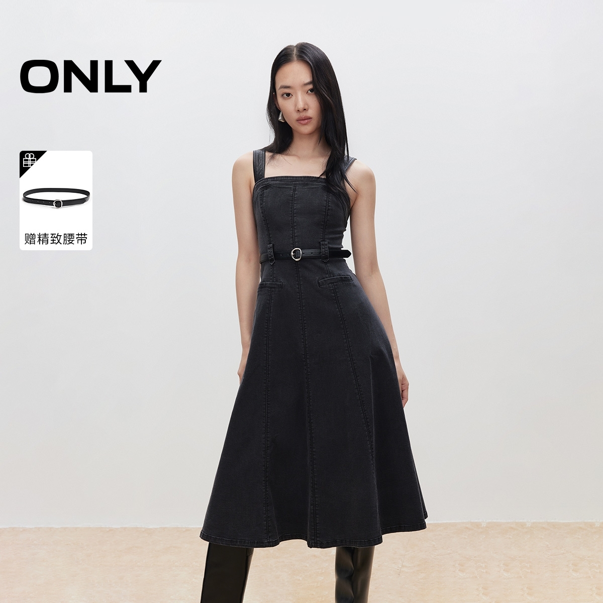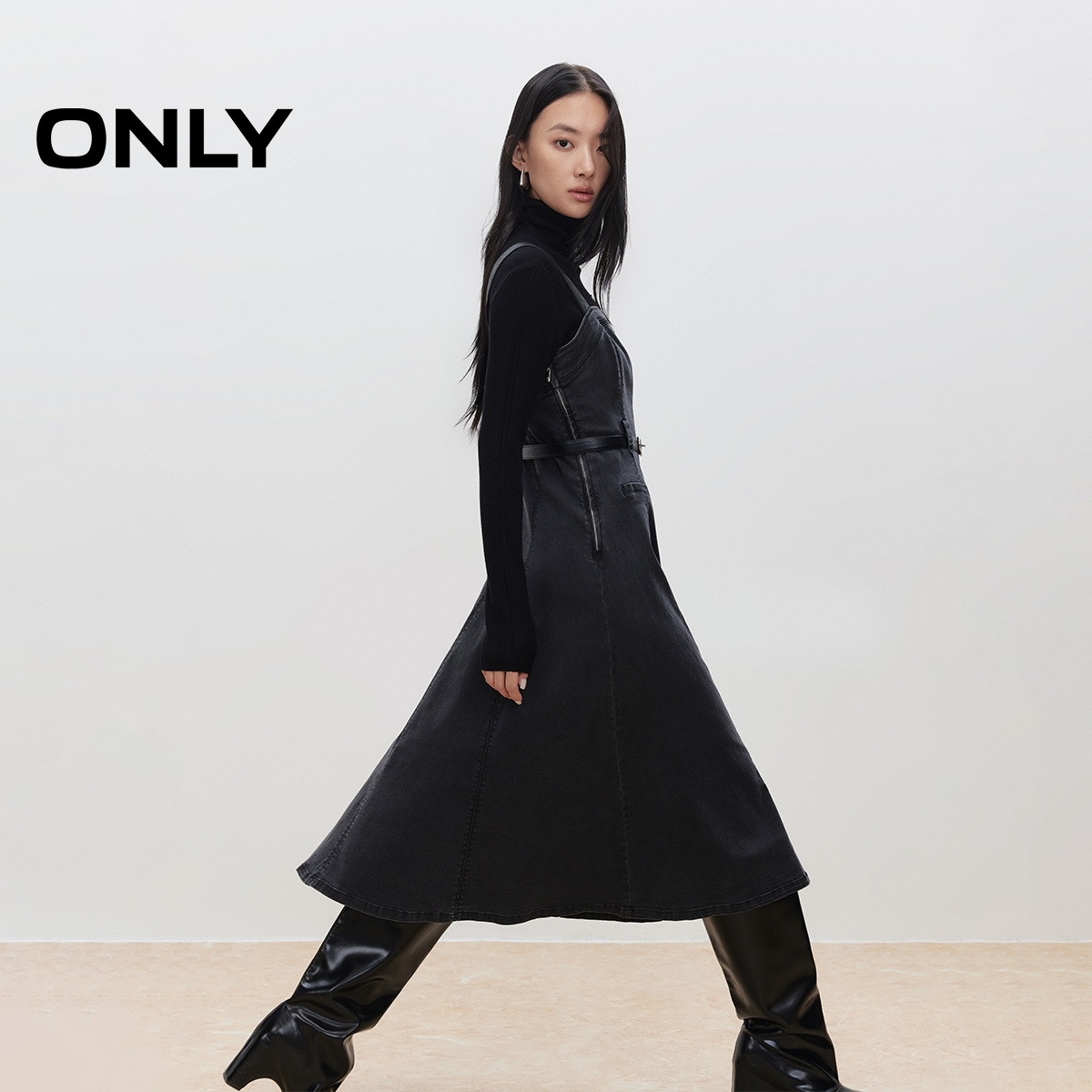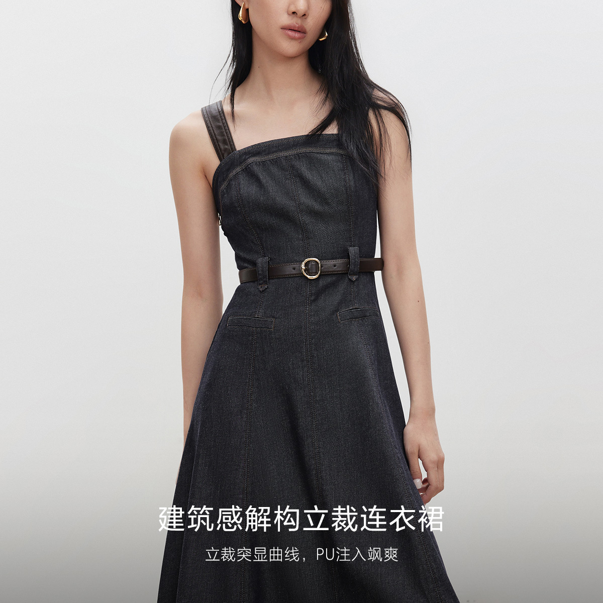 中长款 潮酷PU拼接肩带修身 吊带牛仔裙连衣裙女 新款 ONLY2025秋季