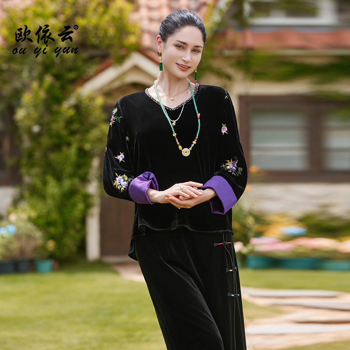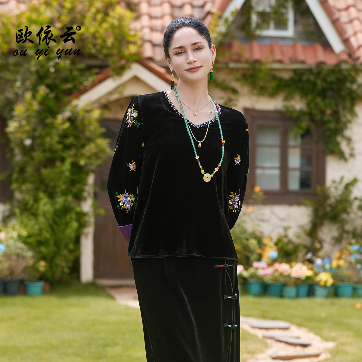 2025新款 女衫 桑蚕丝上衣宽松显瘦洋气刺绣大码 欧依云中年妈妈秋装