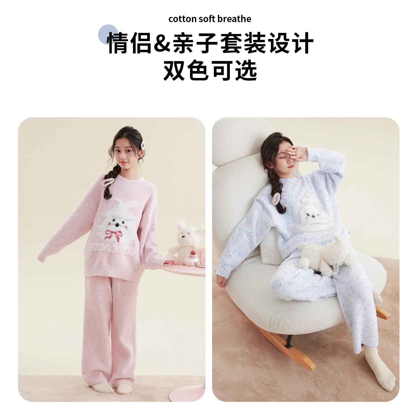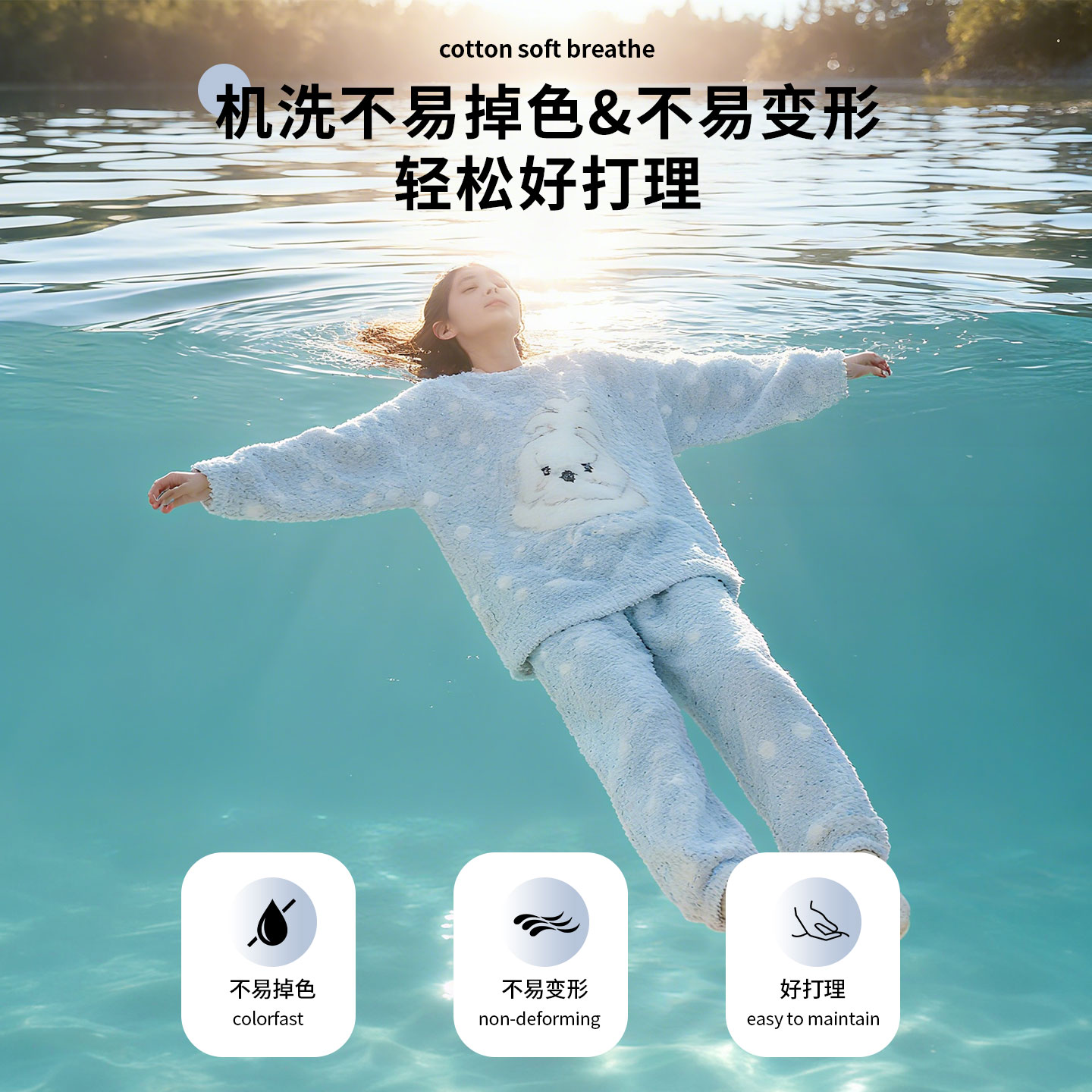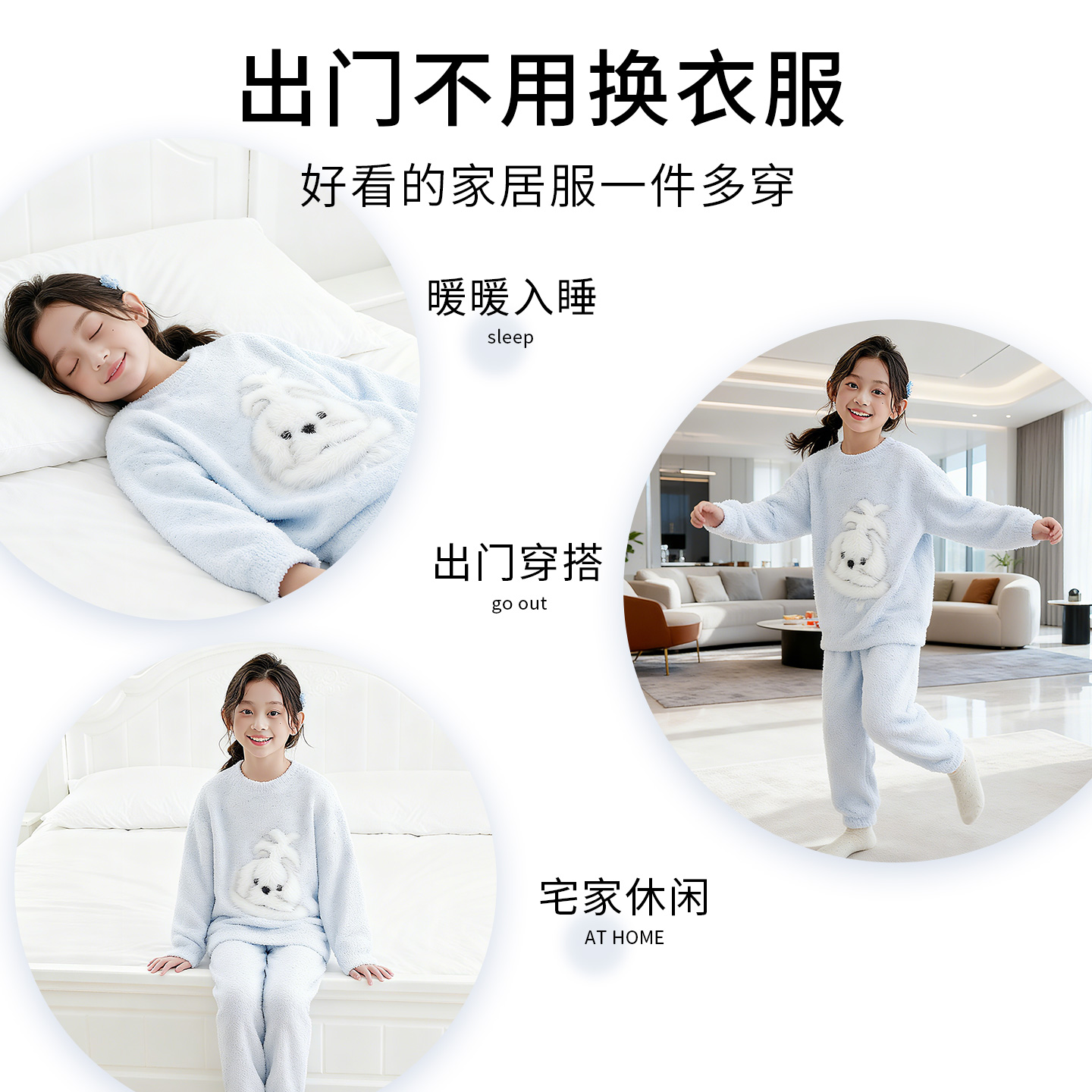 女童蓝色睡衣秋冬法兰绒新款 中大童女孩春秋半边绒 儿童家居服套装