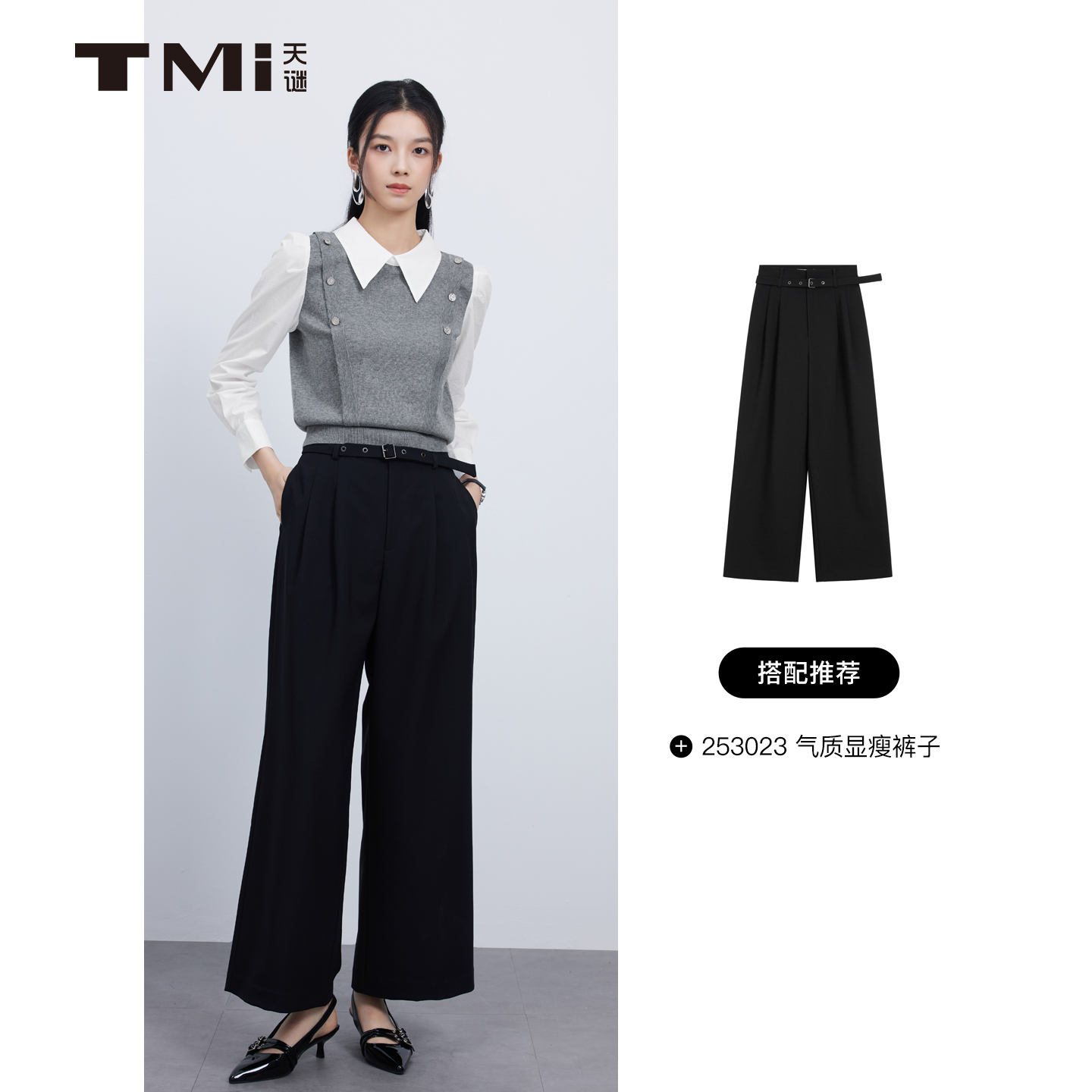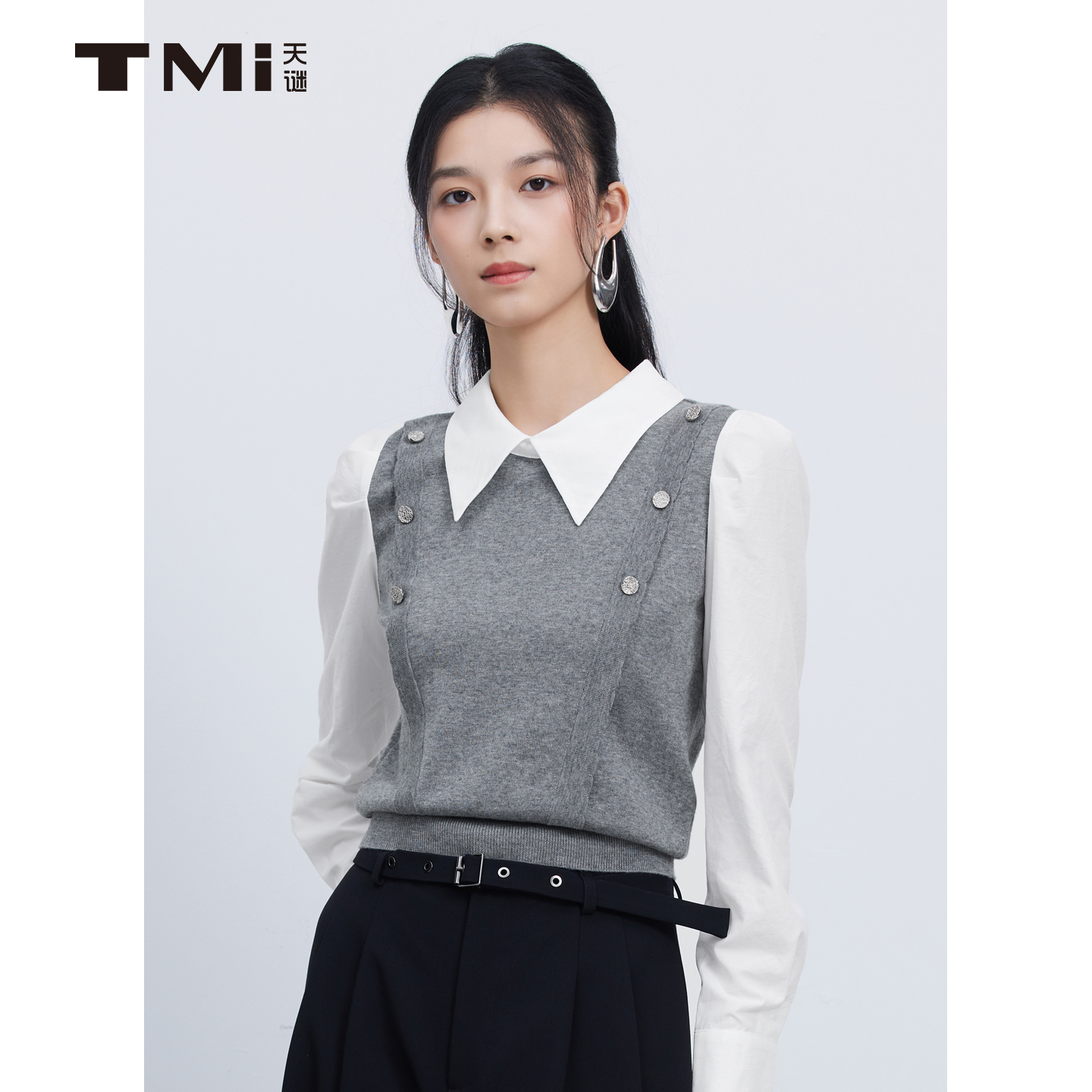 新款 女秋季 叠穿日系复古V领马甲背心 衬衫 白色抽绳设计感宽松长袖