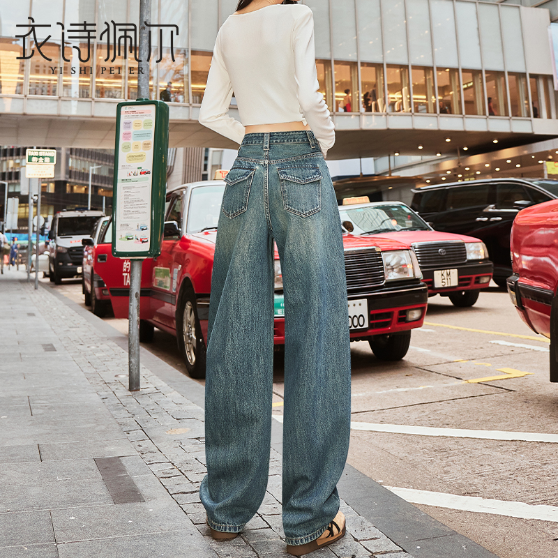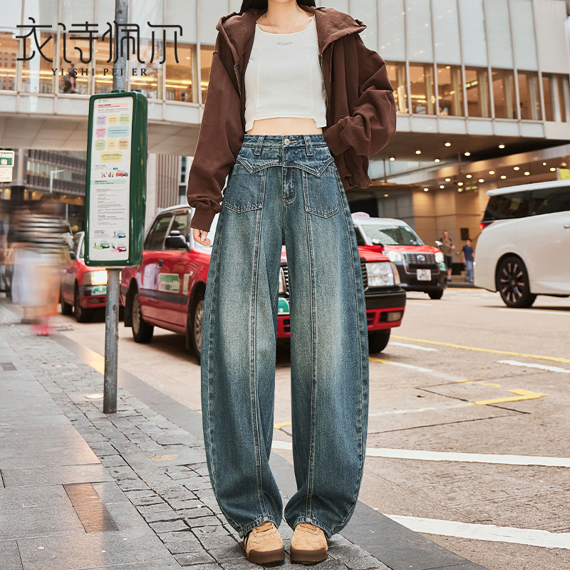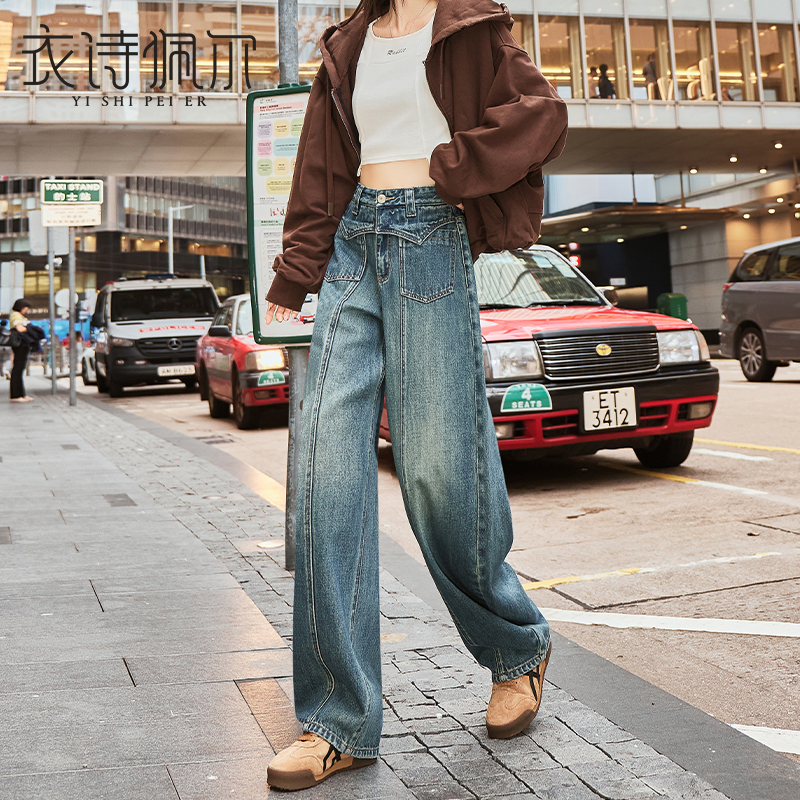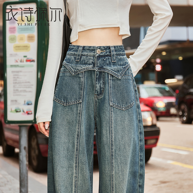 女复古拼接宽松显瘦设计提臀垂感牛仔裤 高腰弯刀裤 子 新款 2025秋季