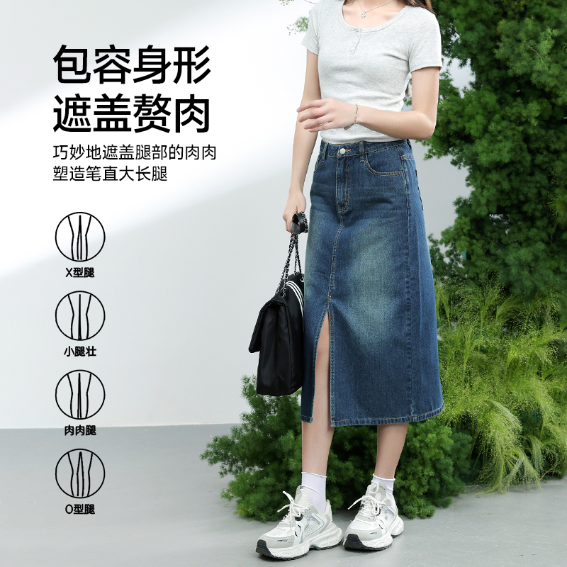 a字裙 高腰蓝色中长款 KMV真维斯梨形身材牛仔半身裙女2025秋季 薄款