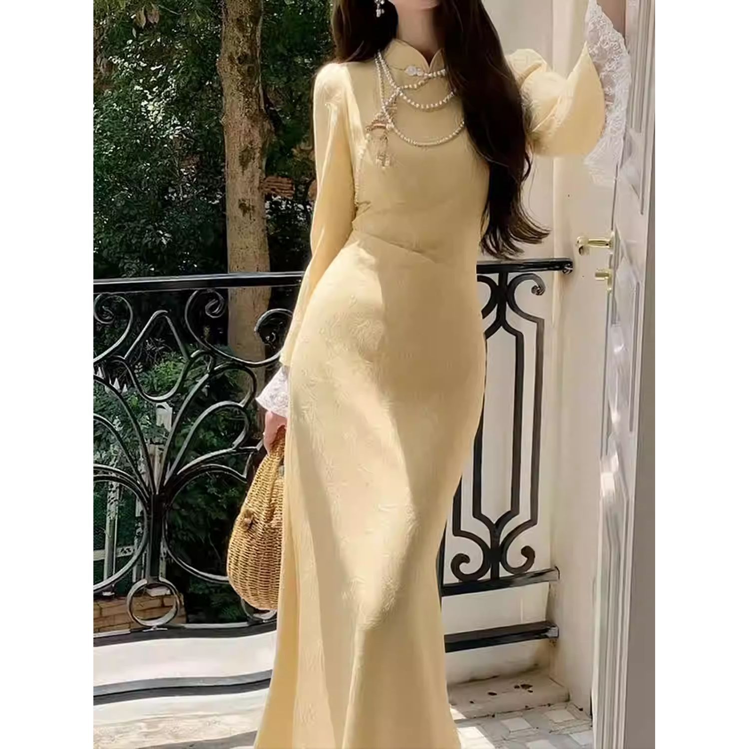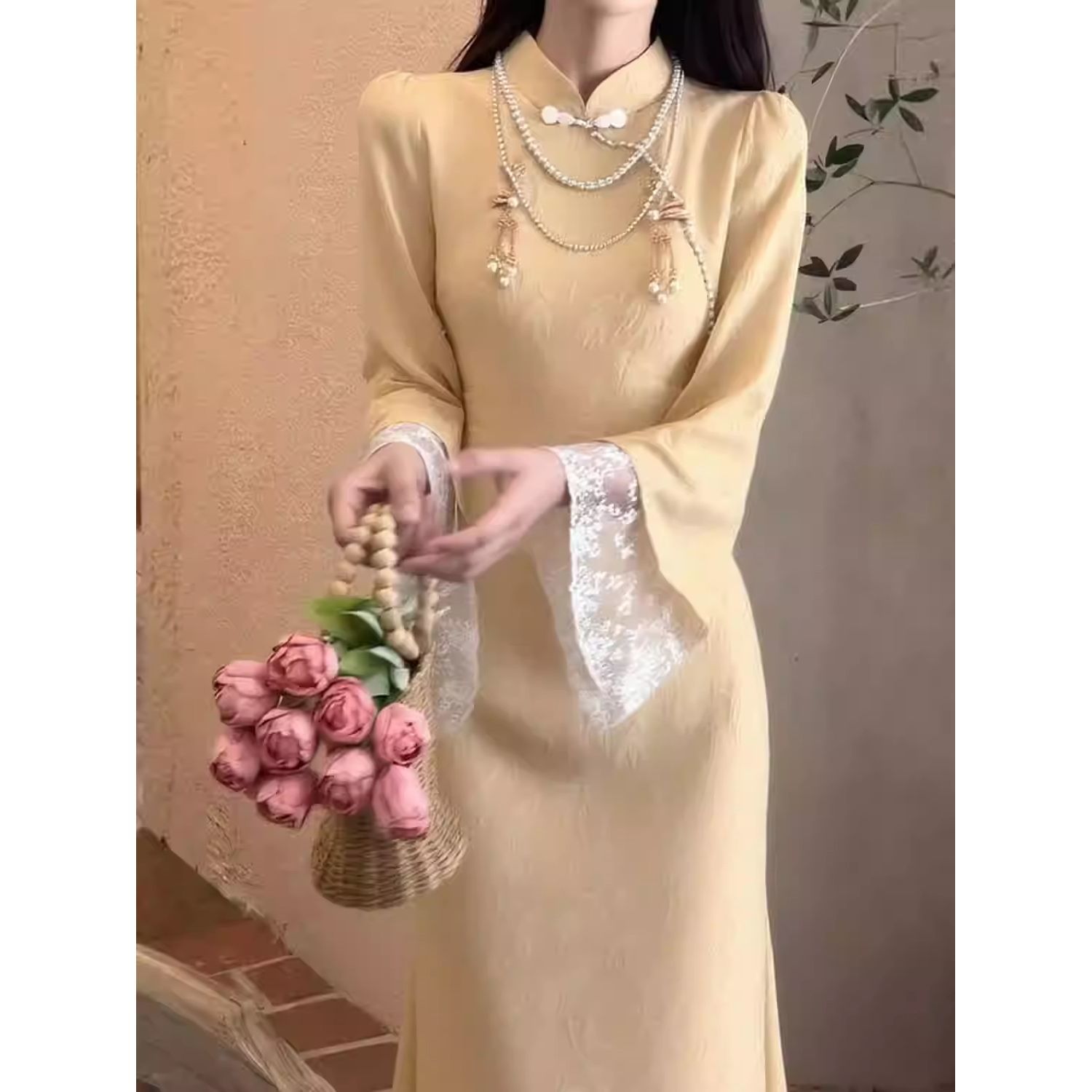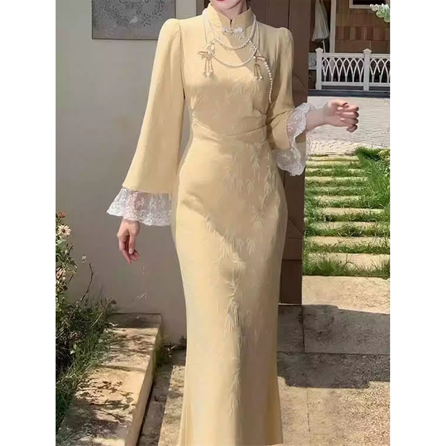 迪丽热巴同款 国风旗袍新款 拼接蕾丝旗袍 新中式 鹅黄色倒大袖