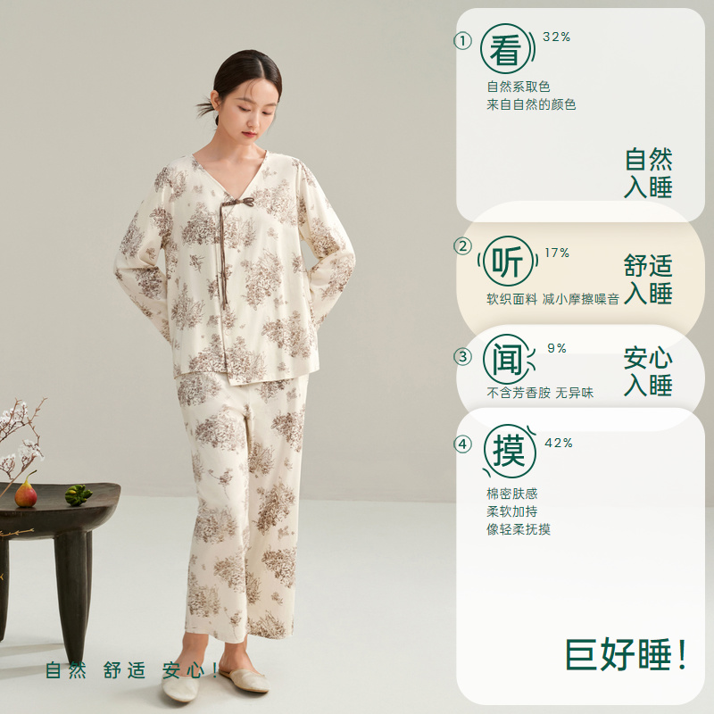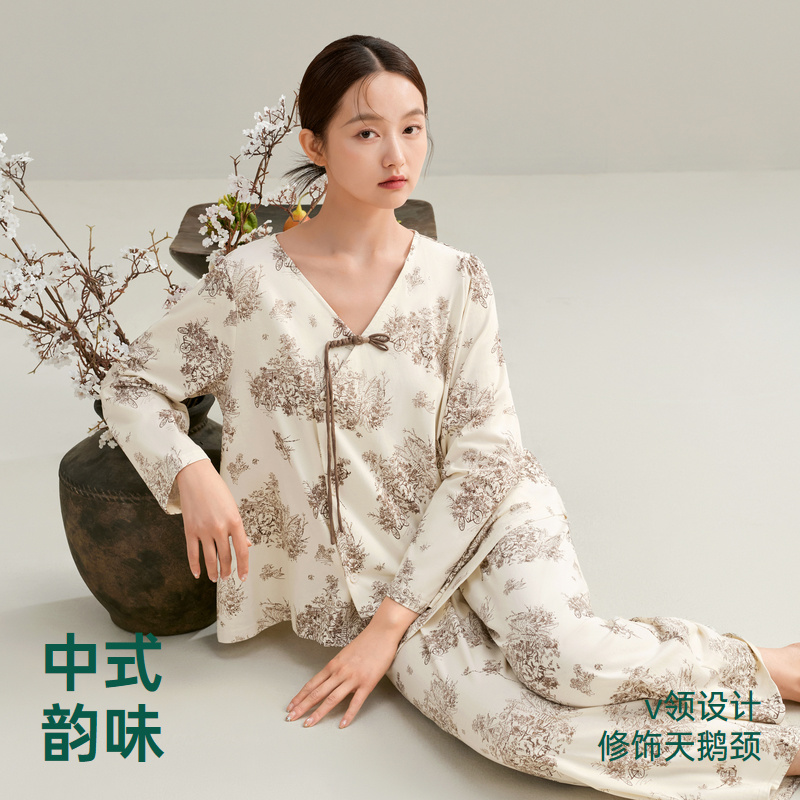 男春秋 带胸垫家居服套装 A类抗菌防螨纯棉情侣睡衣女长袖 红豆夏季