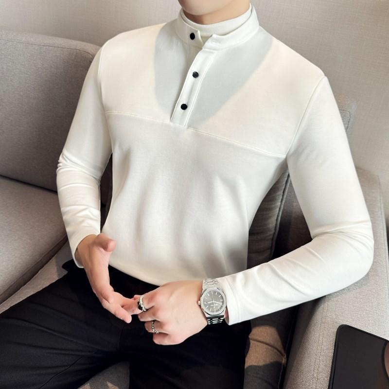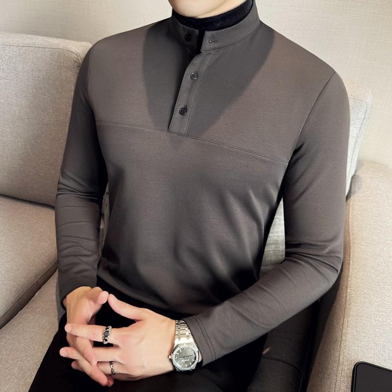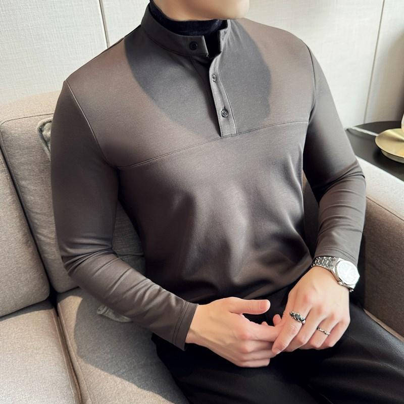 拼接潮流修身 秋冬季 休闲t恤0820z 男长袖 感亨利领假两件中领打底衫