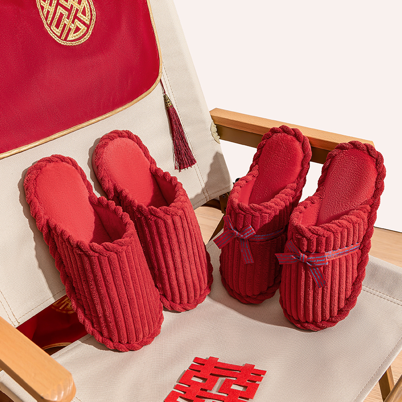 居家用陪嫁婚庆情侣新婚棉拖鞋 冬季 喜庆红色一对喜事拖鞋 结婚拖鞋