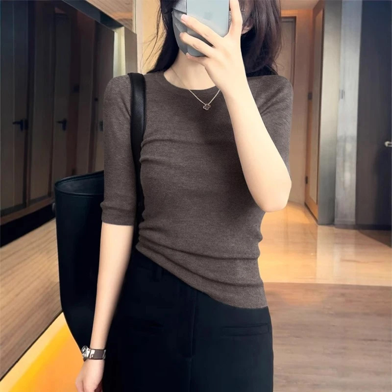 内搭上衣中袖 大码 毛衣女短袖 针织打底衫 t恤胖mm春秋 半高领五分袖