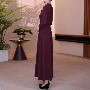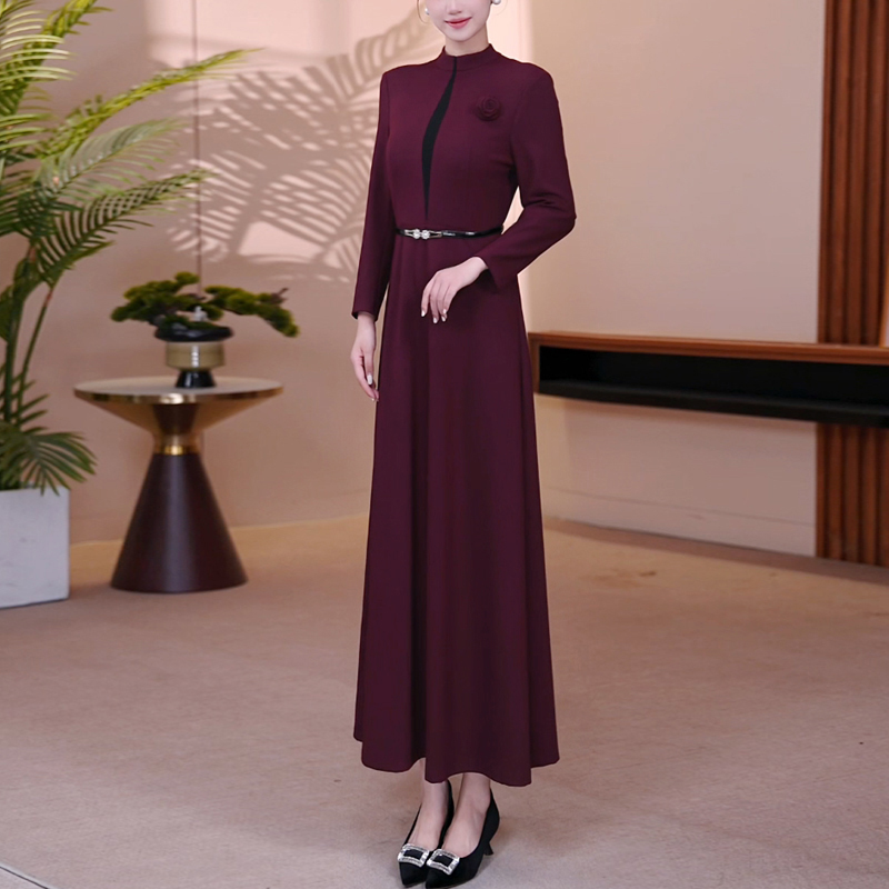 气质收腰显瘦减龄长裙 时尚 酒红色撞色立领长袖 连衣裙女秋2025新款