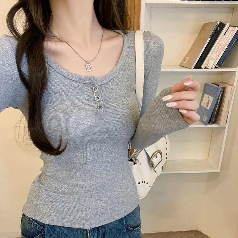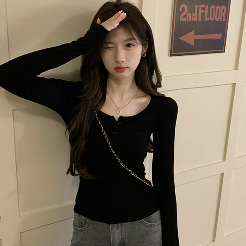 上衣u领纽扣长袖 回力白色内搭打底衫 胖mm修身 2025新款 t恤 女春秋季