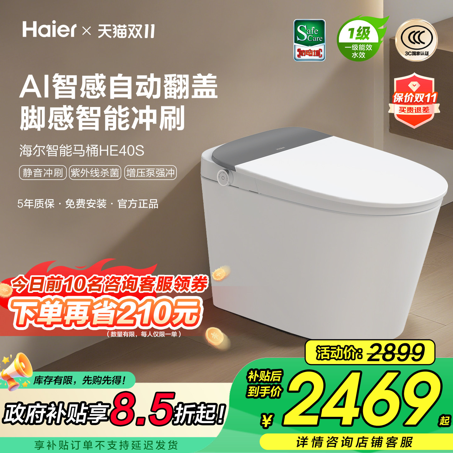 海尔智能马桶全自动翻盖泡沫盾家用0水压坐便器HE50S 政府补贴