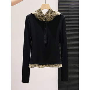 显瘦帽衫 修身 上衣 t恤女2025早秋新款 复古假两件撞色拼接连帽长袖