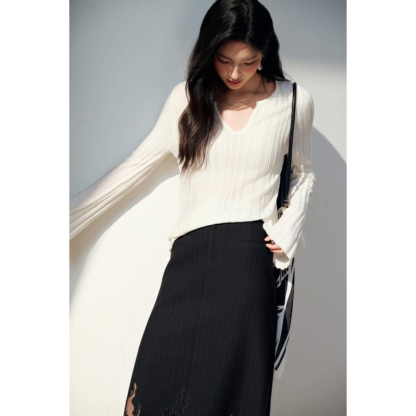 House 纯色显瘦长袖 百家好v领坑条针织衫 新款 套头上衣 秋季 Basic
