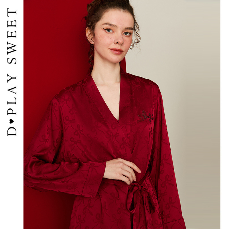 结婚晨袍外套新品 DPLAYSWEET法式 简约红色缎面蝴蝶结提花睡袍短款
