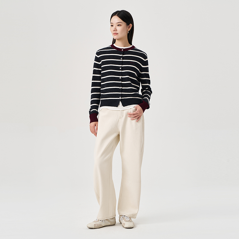 女百搭圆领针织衫 宽松条纹撞色100%绵羊毛织开衫 新品 OTT2025冬季