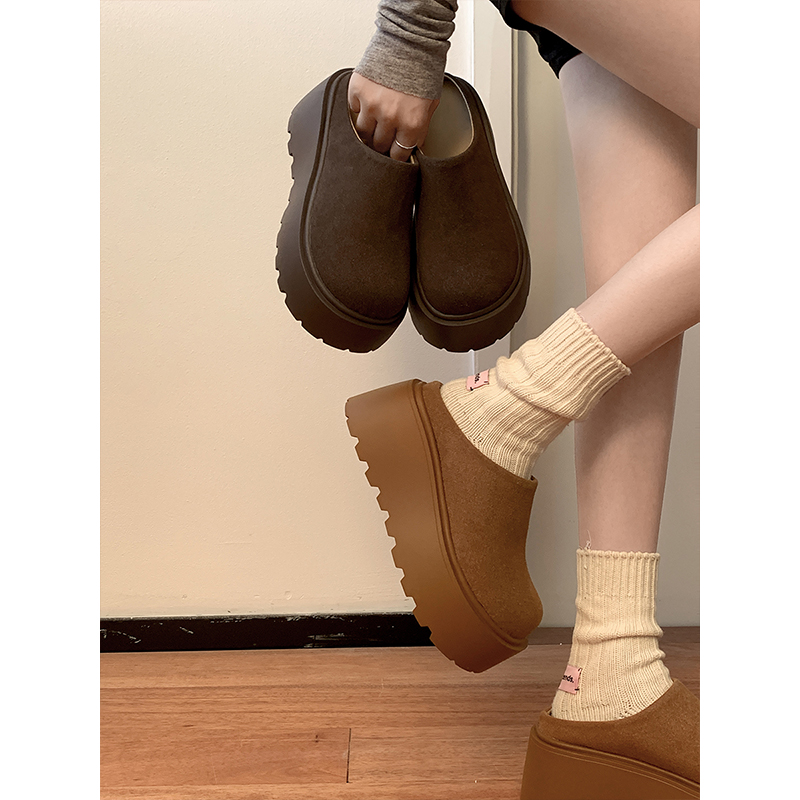 灰色毛呢复古内增高5cm勃肯鞋 女厚底小土豆加绒保暖包头毛毛拖鞋