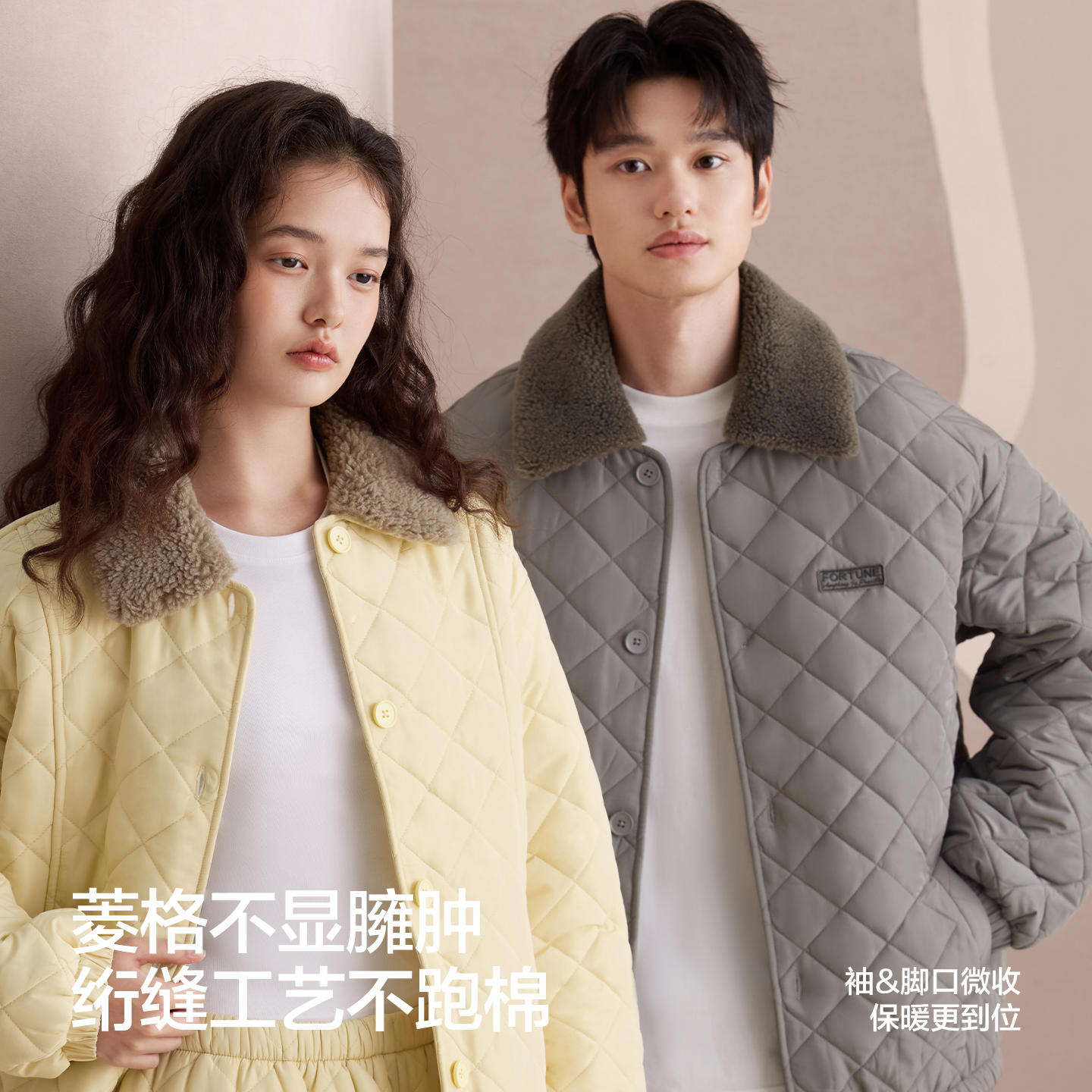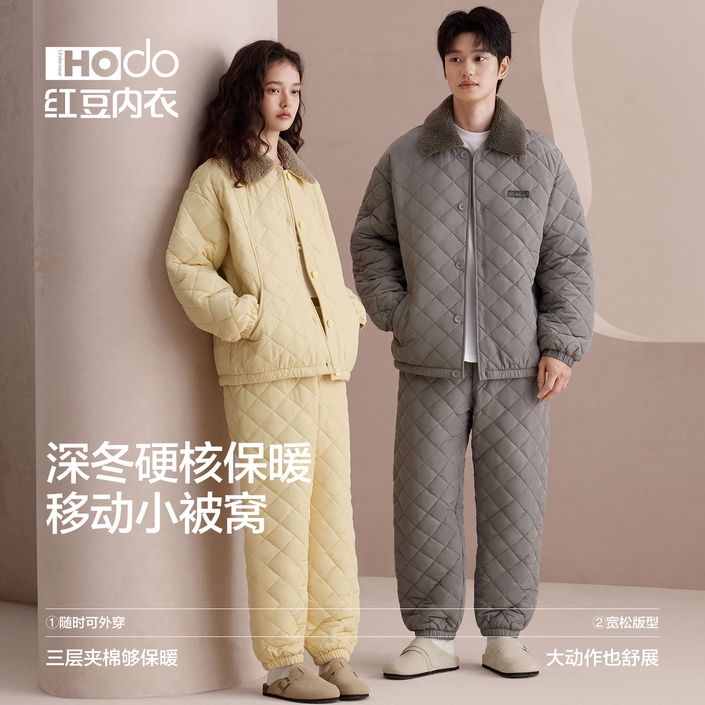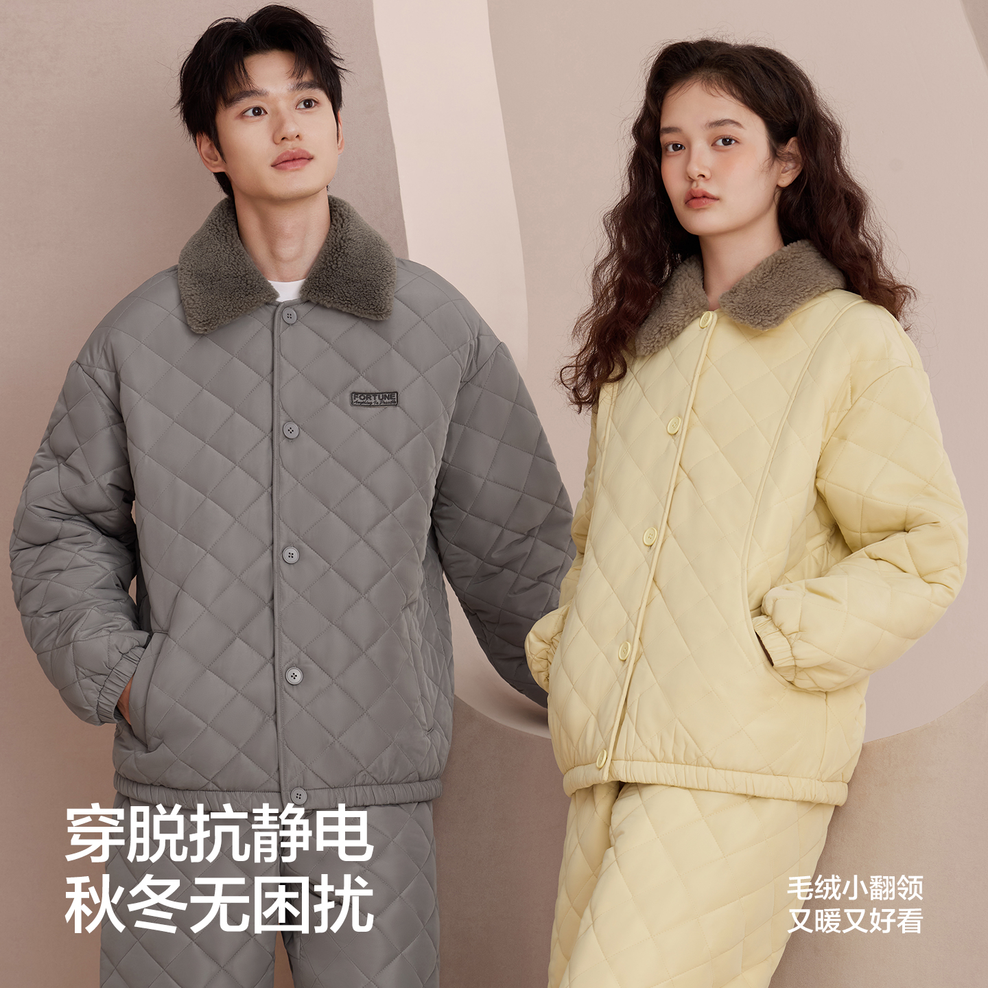 预售红豆夹棉睡衣加厚男女外穿棉服抗寒防风翻领格纹抗静电家居服
