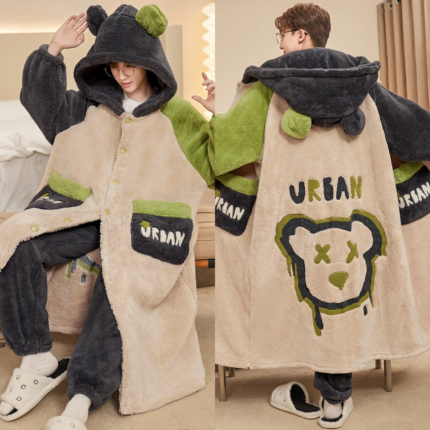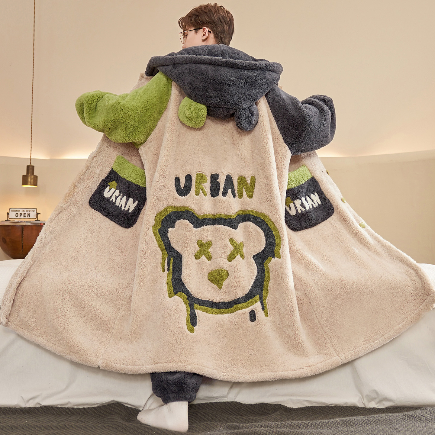 男士 珊瑚绒加绒加厚流体熊睡袍青少年法兰绒浴袍家居服 睡衣秋冬季