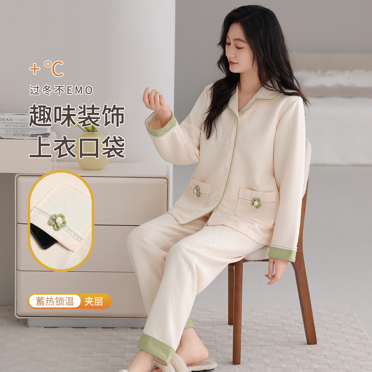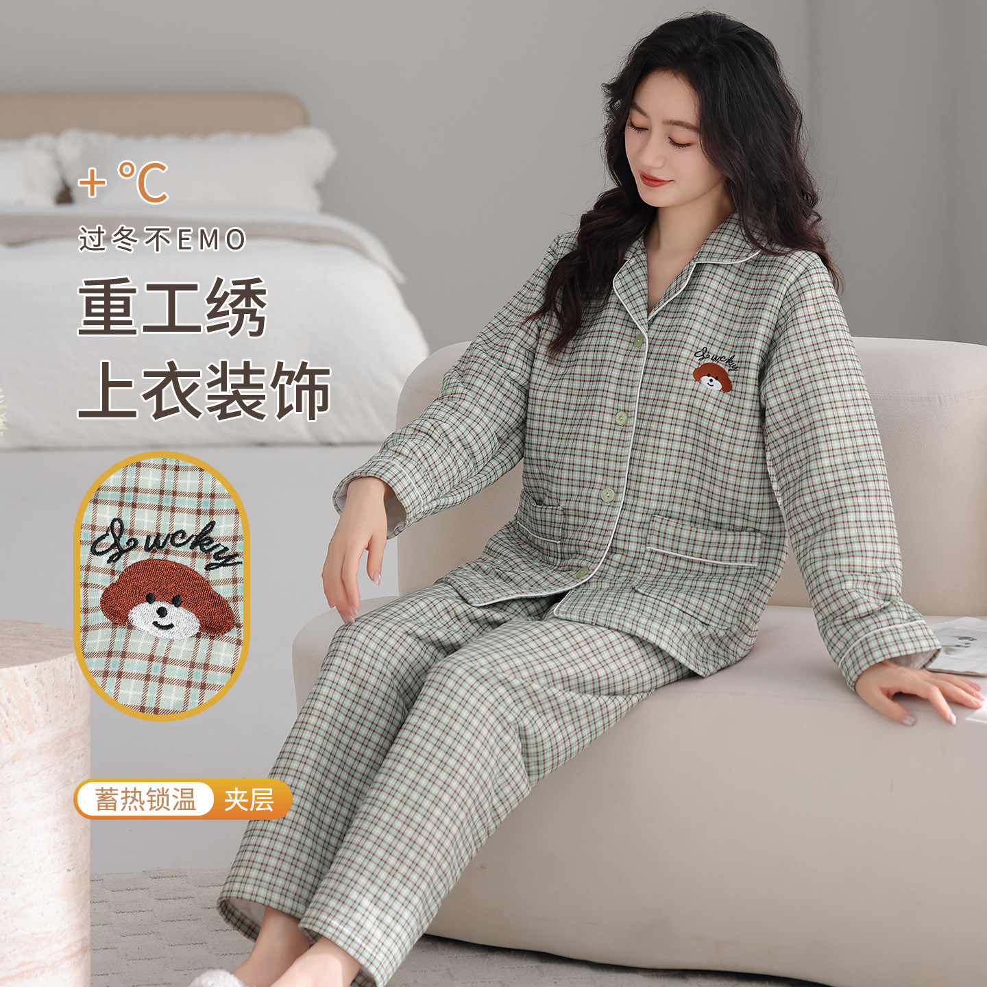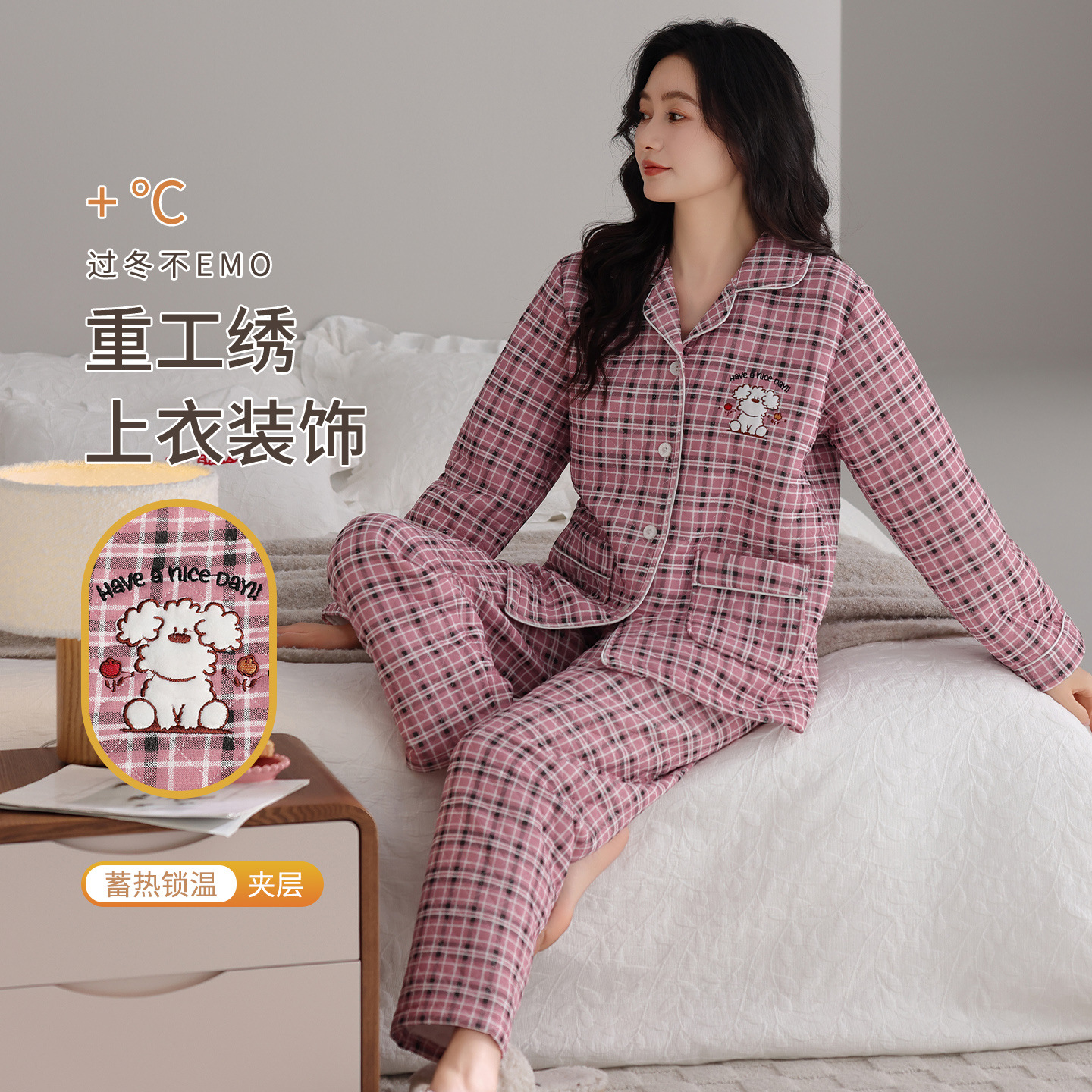 带胸垫防凸点全棉家居服套装 秋冬款 长袖 纯棉秋季 睡衣女士2025新款
