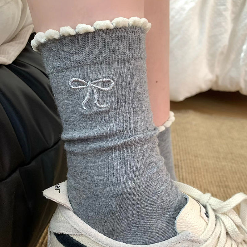棕咖色月子长袜 乐福鞋 木耳边堆堆袜子女秋冬季 纯棉中筒袜配小皮鞋